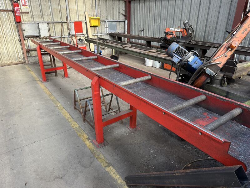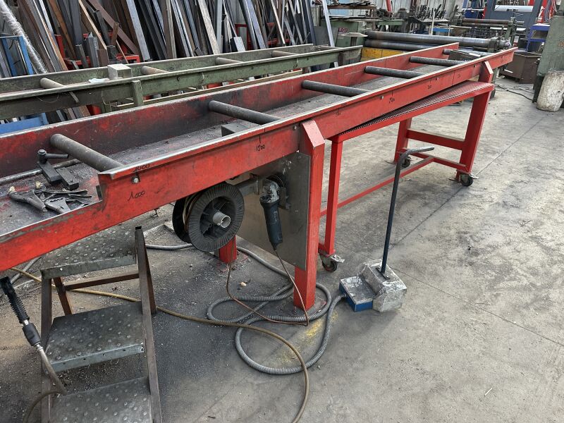 2 chemins à rouleaux métal rouge (fabrication interne), environ 4.50 m et 5 m 1 marchepied Equipant la scie FMB No 53
