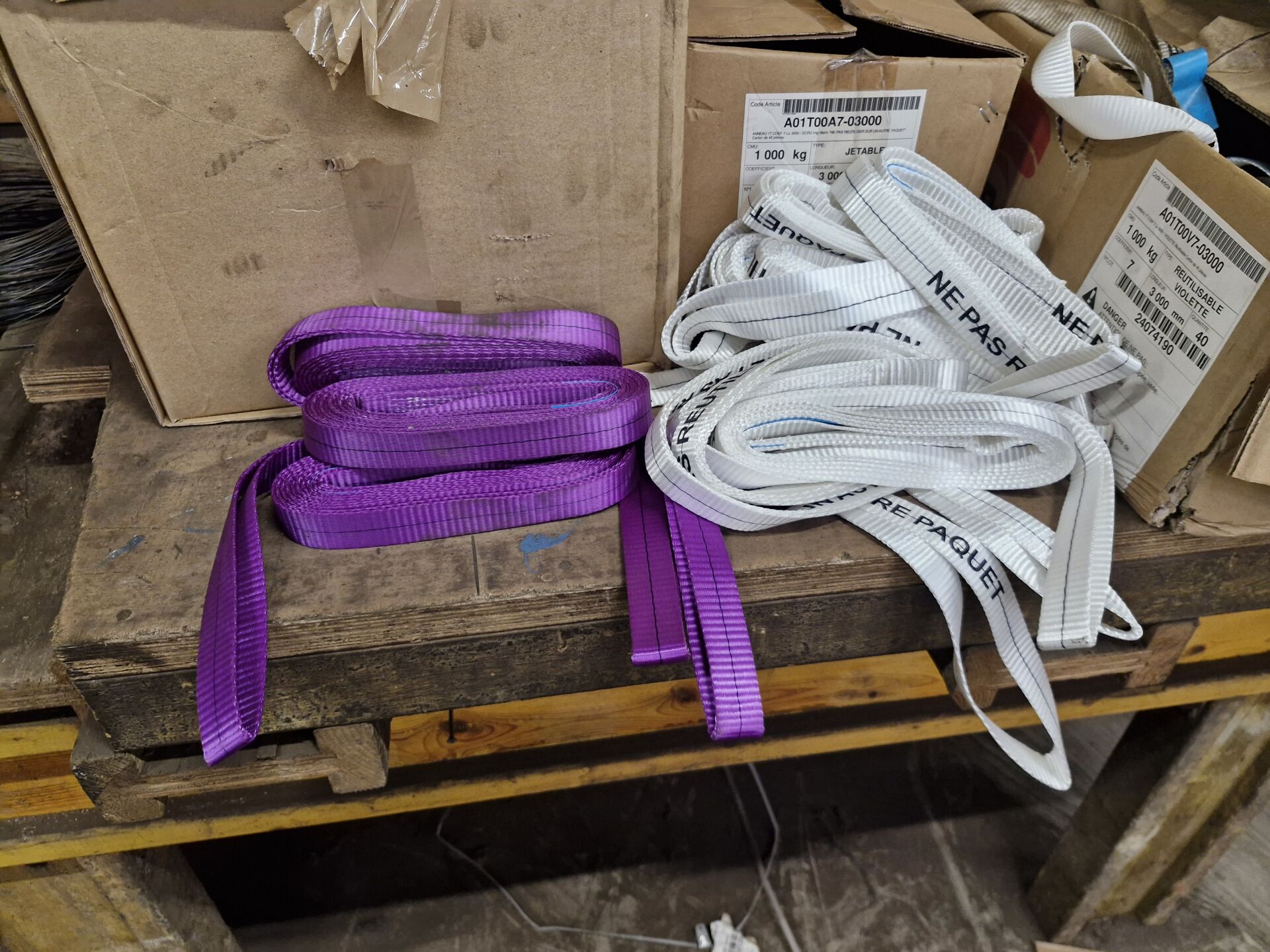10 cartons de 40 élingues jetables de 3 m en 1 T + 10 cartons entamés sur établi