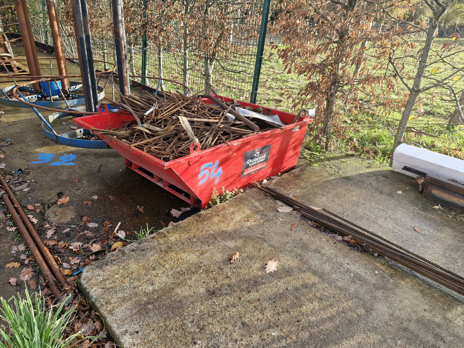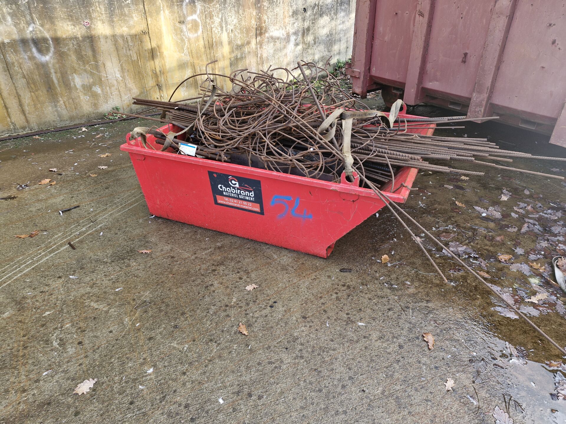 3 bacs métal rouge ou jaune avec prise fourche 500 litres + 1 bac acier grillagé