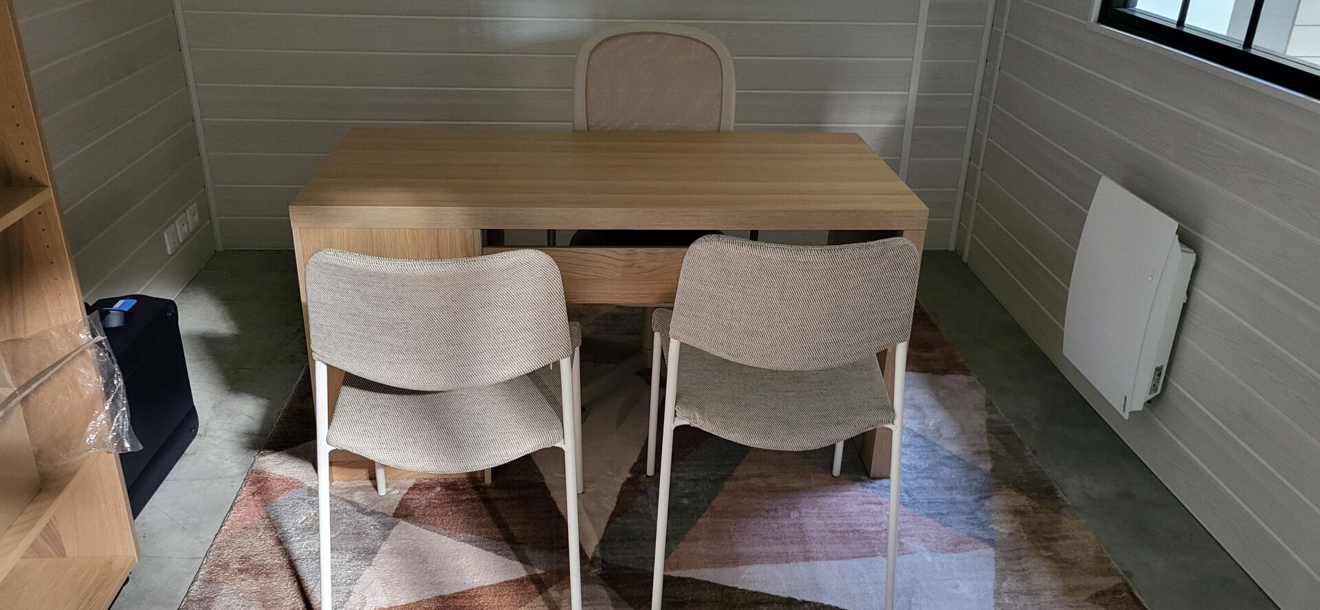 Vendu sur désignation le 23 10 2025 à 10h30, visible le 23/10/2025 à 9H à CARQUEFOU, enlèvement le 30/10/2025 de 9h à 12h, frais mise à disposition 10 € TTC par lot 1 bureau mélaminé façon bois avec caisson 2 tiroirs intégré 140 x 65 cm 1 étagère mi-hauteur assortie 4 niveaux 80 x 45 x 120 cm 1 armoire mi-hauteur assortie 2 portes 80 x 45 x 120 cm 1 fauteuil tournant et roulant filet et tissu beige 2 chaises tissu gris chiné piétement métal blanc 1 tapis