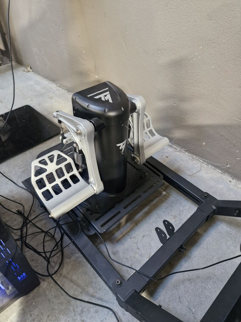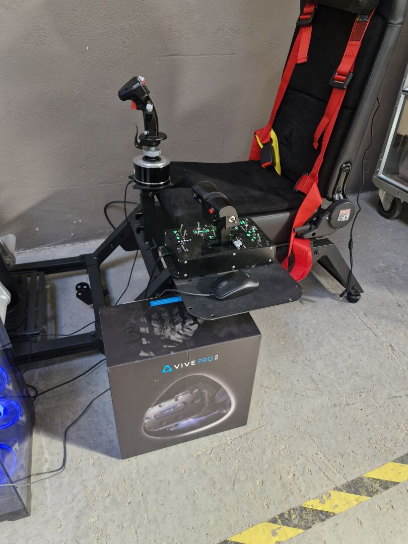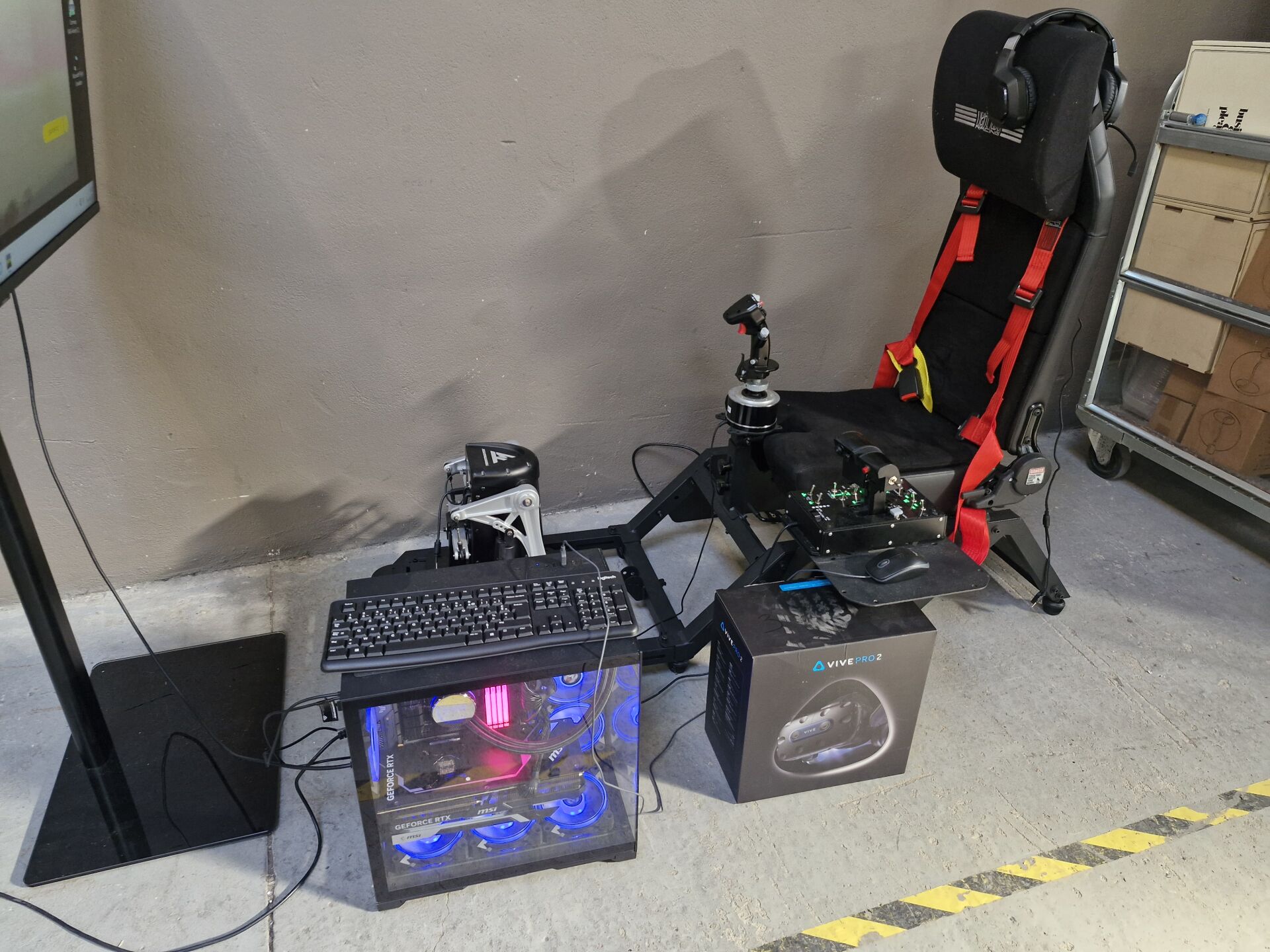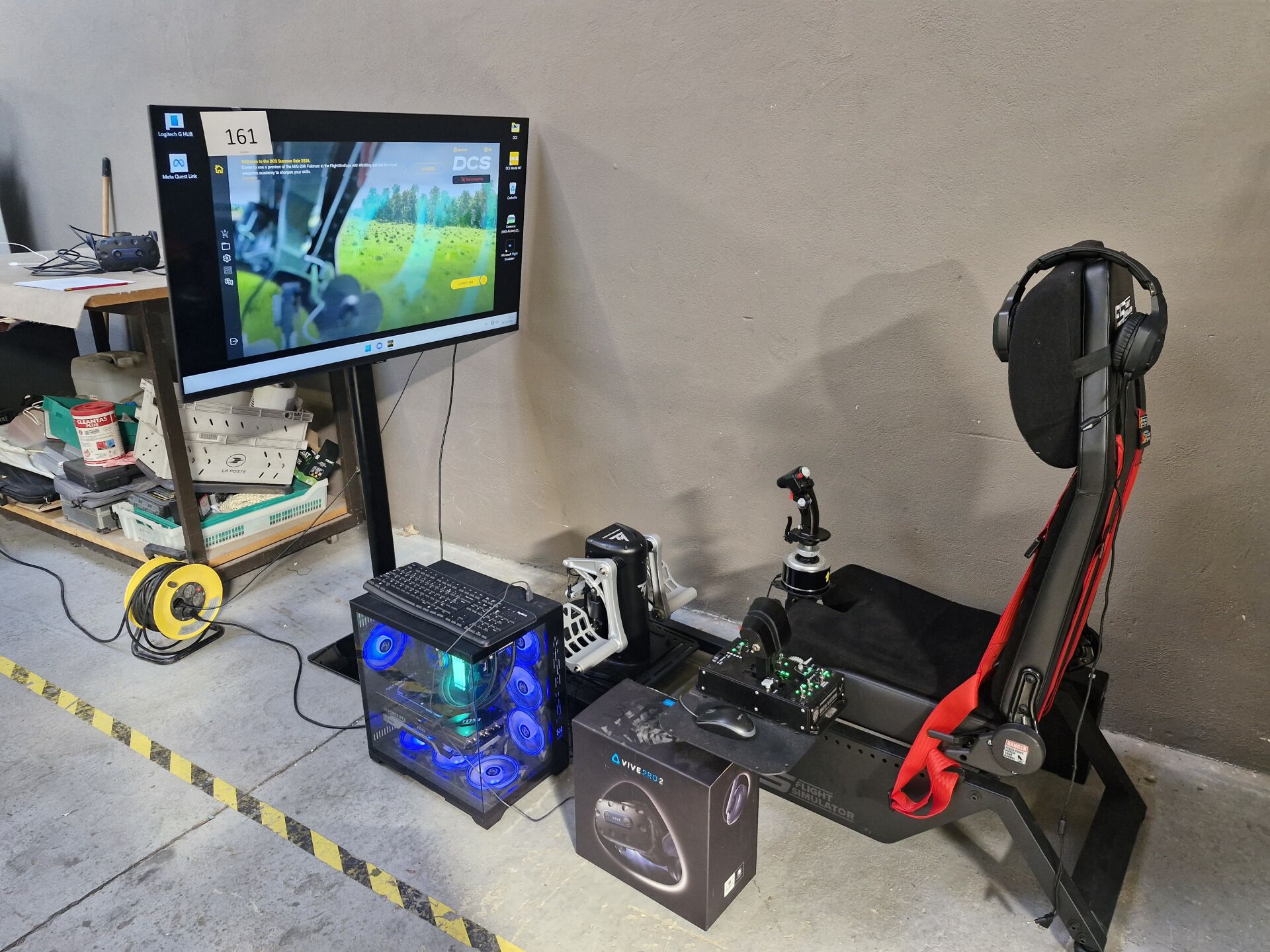 Poste de simulation de vols, composé de : 1 siège de cockpit de simulation de vol NEXT LEVEL RACING, 1 commande de vol avec joystick et palonnier THRUSTMASTER HOTAS WARTHOG, 1 écran SAMSUNG TU50CU7025KXXC et son pied, 1 onduleur EATON Ellipse ECO 650, 1 unité centrale MRED Crystal Sea 3.0, avec carte graphique MSI RTX 4080 Ventus 1 casque de réalité virtuelle HTC VIVE PRO 2, Dans boîte plastique, 1 ensemble de câbles de connexion, 1 casque audio, 1 clavier,