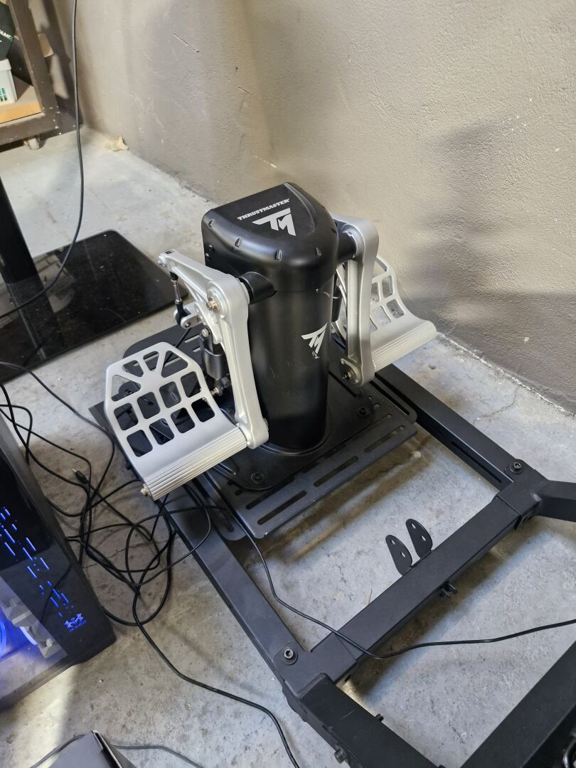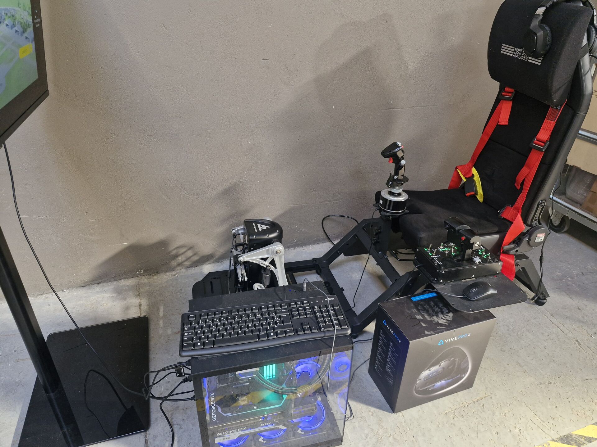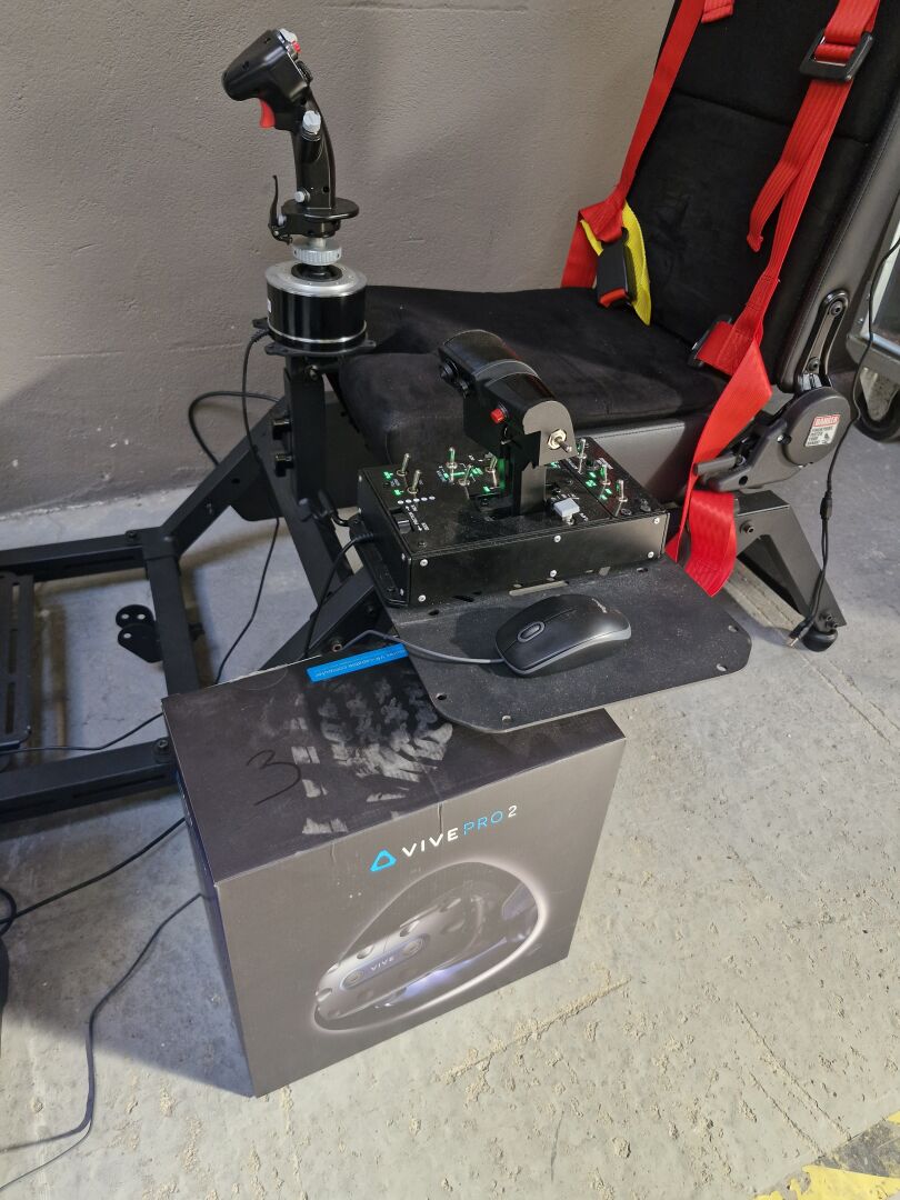 Poste de simulation de vols, composé de : 1 siège de cockpit de simulation de vol NEXT LEVEL RACING, 1 commande de vol avec joystick et palonnier THRUSTMASTER HOTAS WARTHOG, 1 écran SAMSUNG TU50CU7025KXXC et son pied, 1 onduleur EATON Ellipse ECO 650, 1 unité centrale MRED Crystal Sea 3.0, avec carte graphique MSI RTX 4080 Ventus 1 casque de réalité virtuelle HTC VIVE PRO 2, Dans boîte plastique, 1 ensemble de câbles de connexion, 1 casque audio, 1 clavier,