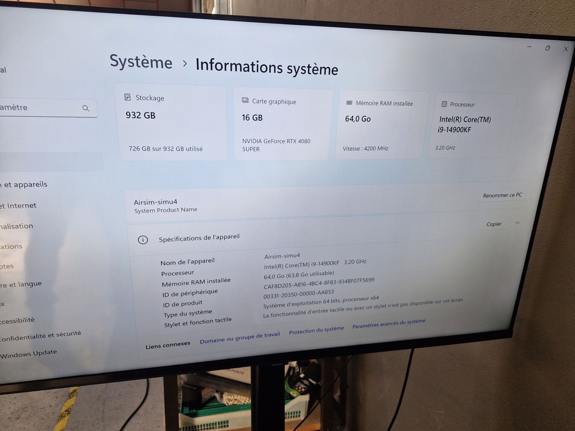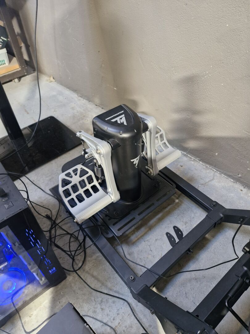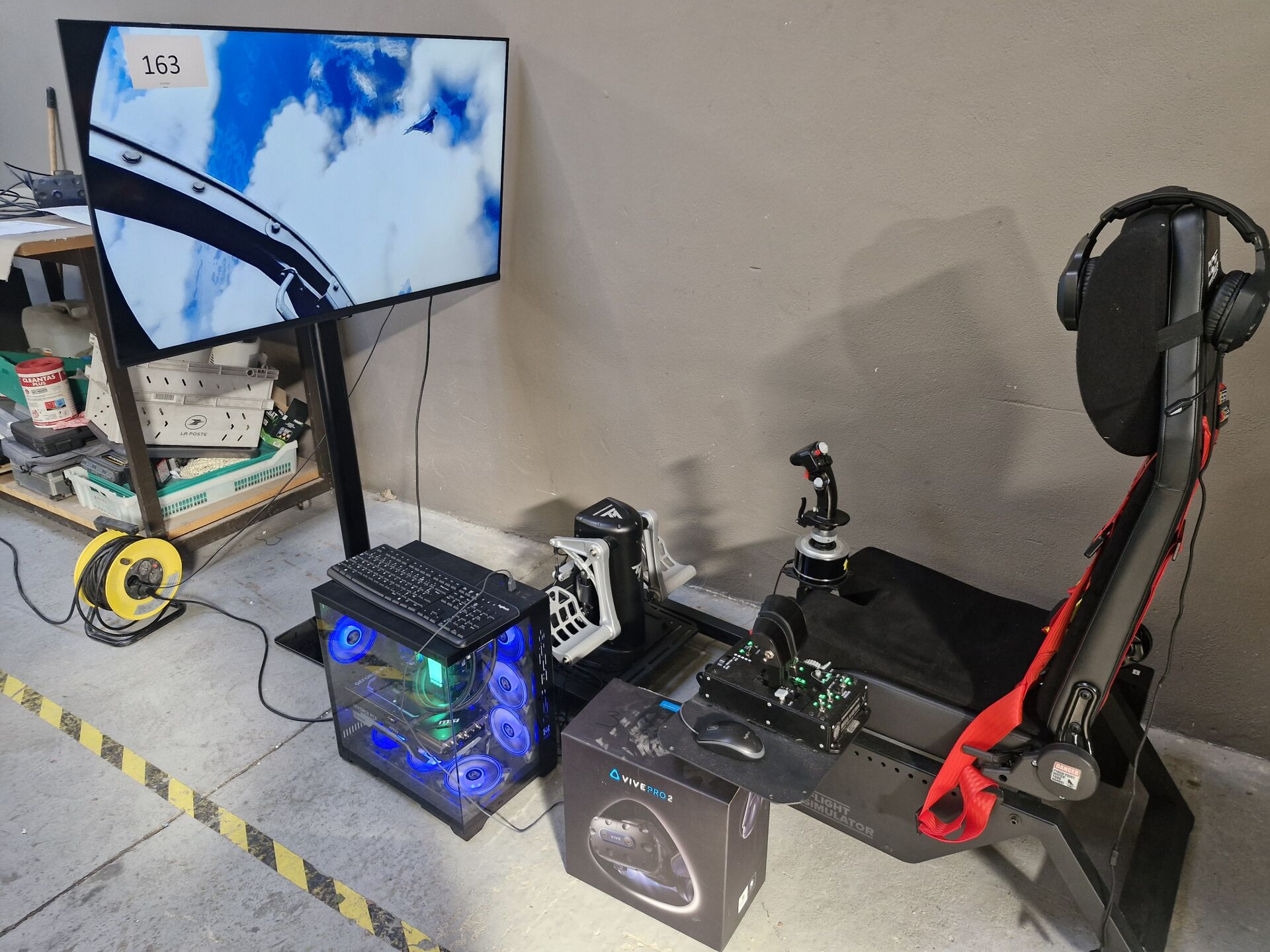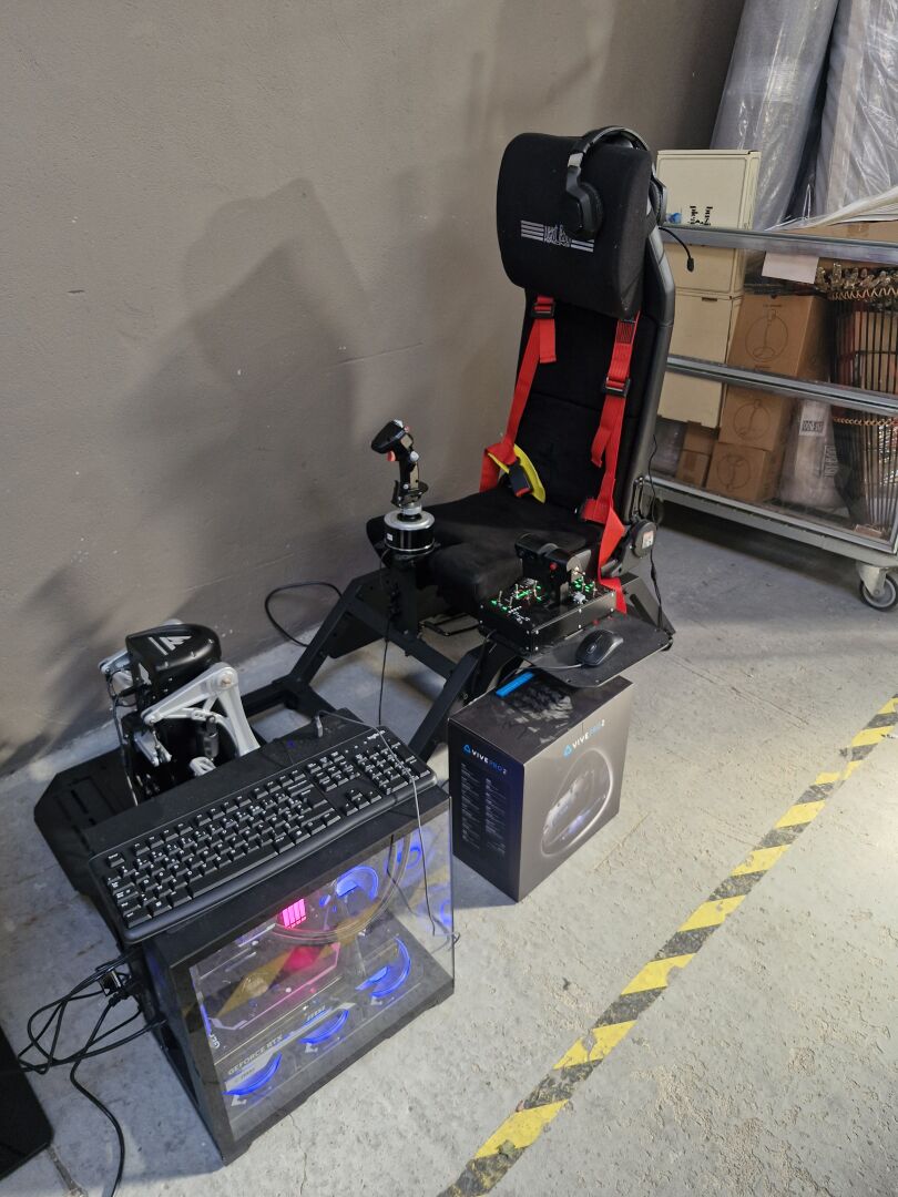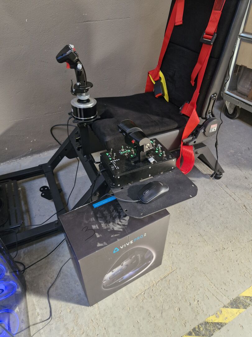Poste de simulation de vols, composé de : 1 siège de cockpit de simulation de vol NEXT LEVEL RACING, 1 commande de vol avec joystick et palonnier THRUSTMASTER HOTAS WARTHOG, 1 écran SAMSUNG TU50CU7025KXXC et son pied, 1 onduleur EATON Ellipse ECO 650, 1 unité centrale MRED Crystal Sea 3.0, avec carte graphique MSI RTX 4080 Ventus 1 casque de réalité virtuelle HTC VIVE PRO 2, Dans boîte plastique, 1 ensemble de câbles de connexion, 1 casque audio, 1 clavier,