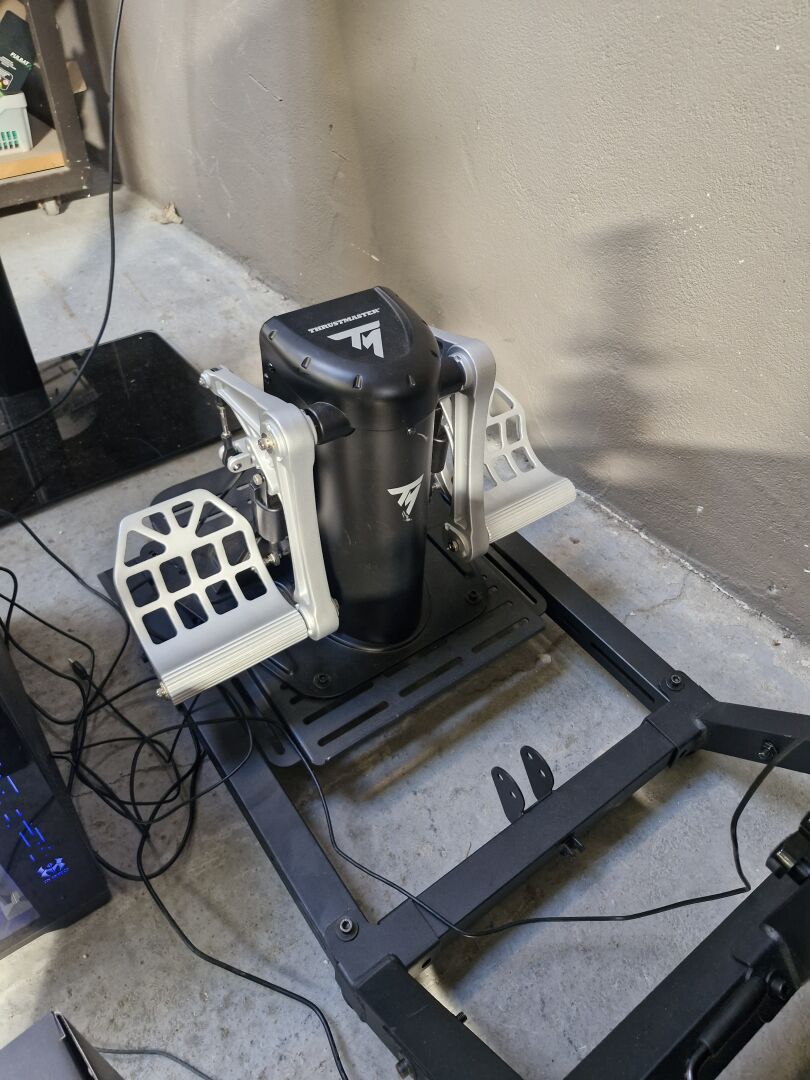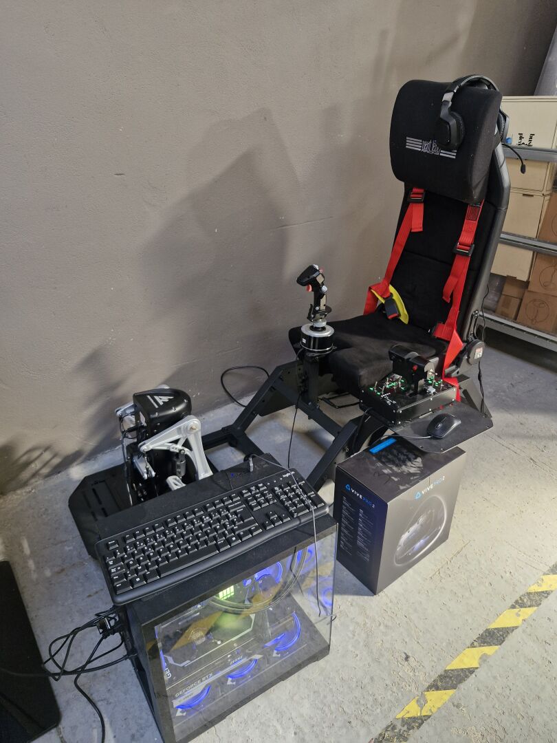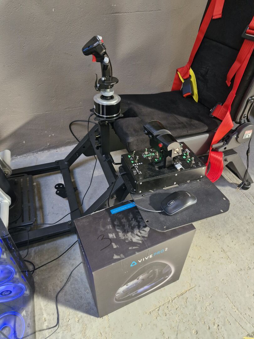 Poste de simulation de vols, composé de : 1 siège de cockpit de simulation de vol NEXT LEVEL RACING, 1 commande de vol avec joystick et palonnier THRUSTMASTER HOTAS WARTHOG, 1 écran SAMSUNG TU50CU7025KXXC et son pied, 1 onduleur EATON Ellipse ECO 650, 1 unité centrale MRED Crystal Sea 3.0, avec carte graphique MSI RTX 4080 Ventus 1 casque de réalité virtuelle HTC VIVE PRO 2, Dans boîte plastique, 1 ensemble de câbles de connexion, 1 casque audio, 1 clavier,