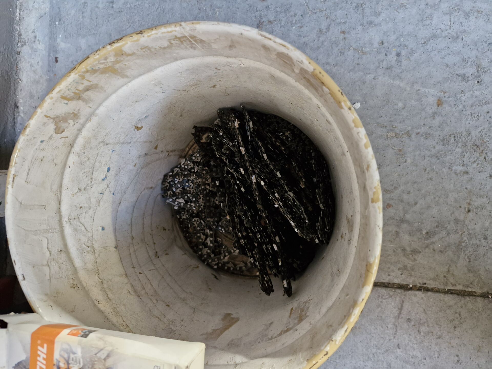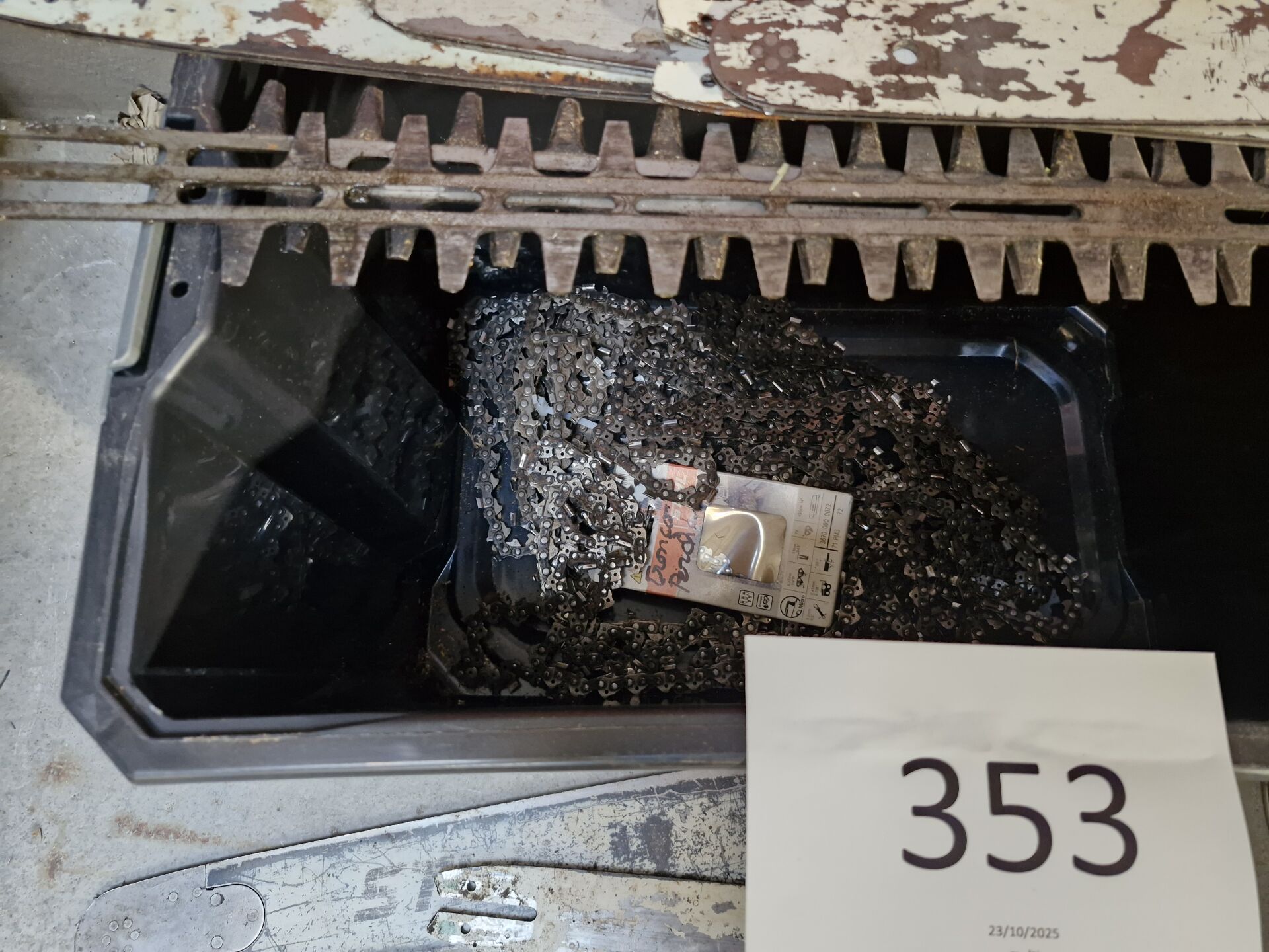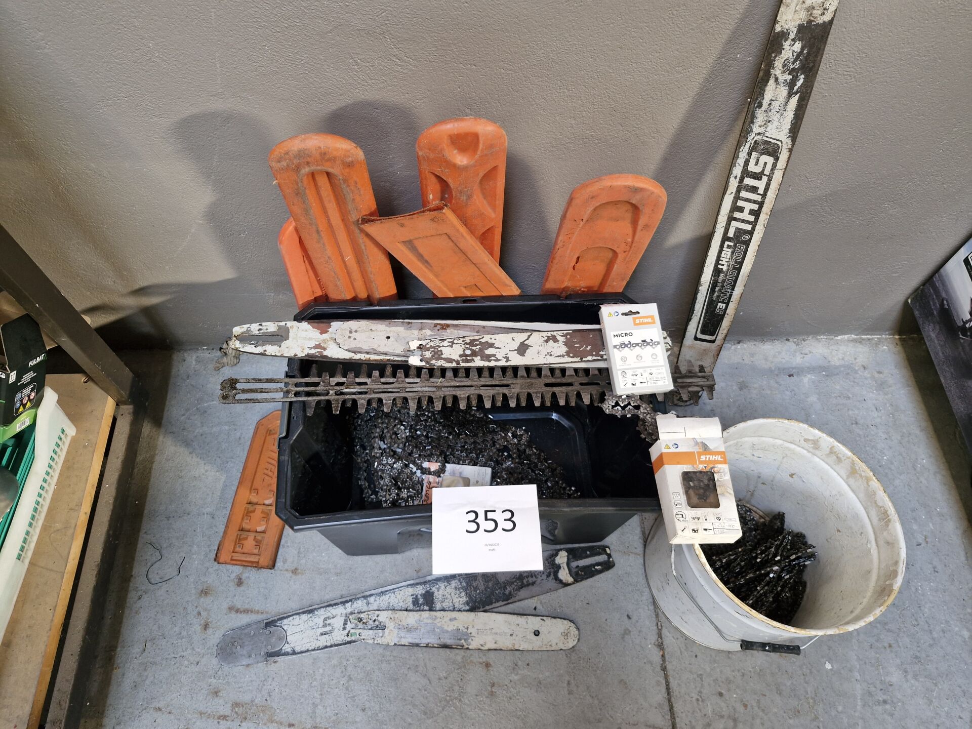 Dans une caisse et 1 seau : 1 ensemble de guides de tronçonneuse et de chaines différents modèles et tailles