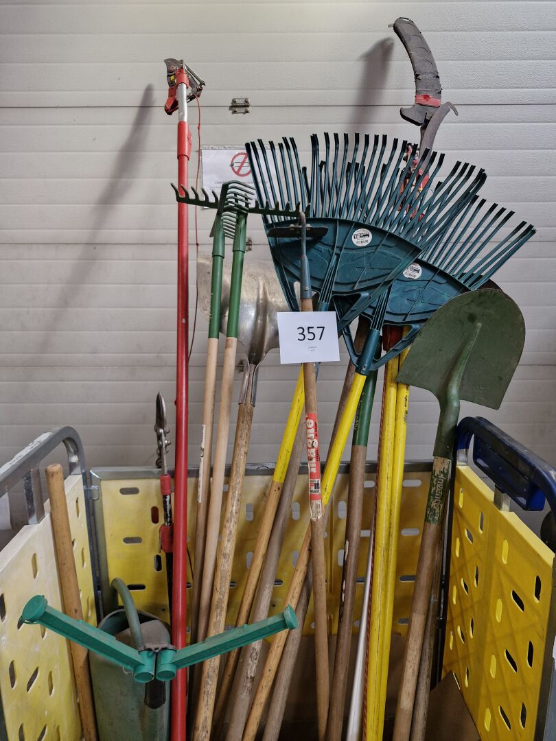 1 lot d'outils de jardin dont râteaux, pelles, balais à feuilles, coupe-branches à perche, 1 échenilloir télescopique etc