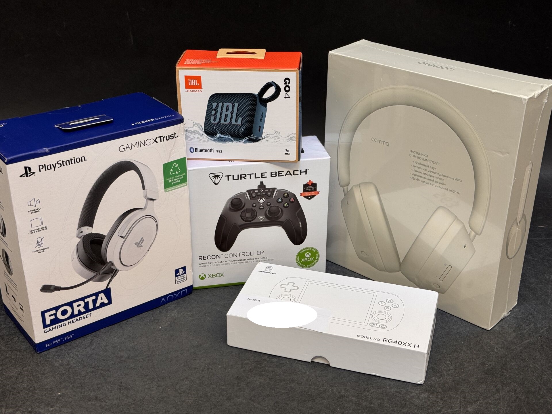 CASQUE, ENCEINTE, MANETTE & CONSOLE DONT ANBERNIC RG40XXH, TURTLE BEACH RECON CONTROLLER, JBL GO 4 EXPEDITION POSSIBLE (ce lot chez vous en France métropolitaine pour 27,85€) Lot issu de colis non réclamés : état de fonctionnement non garanti.