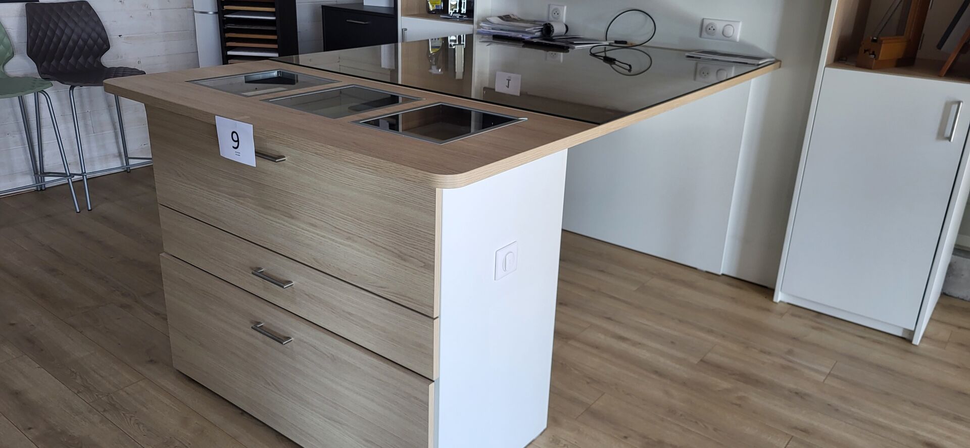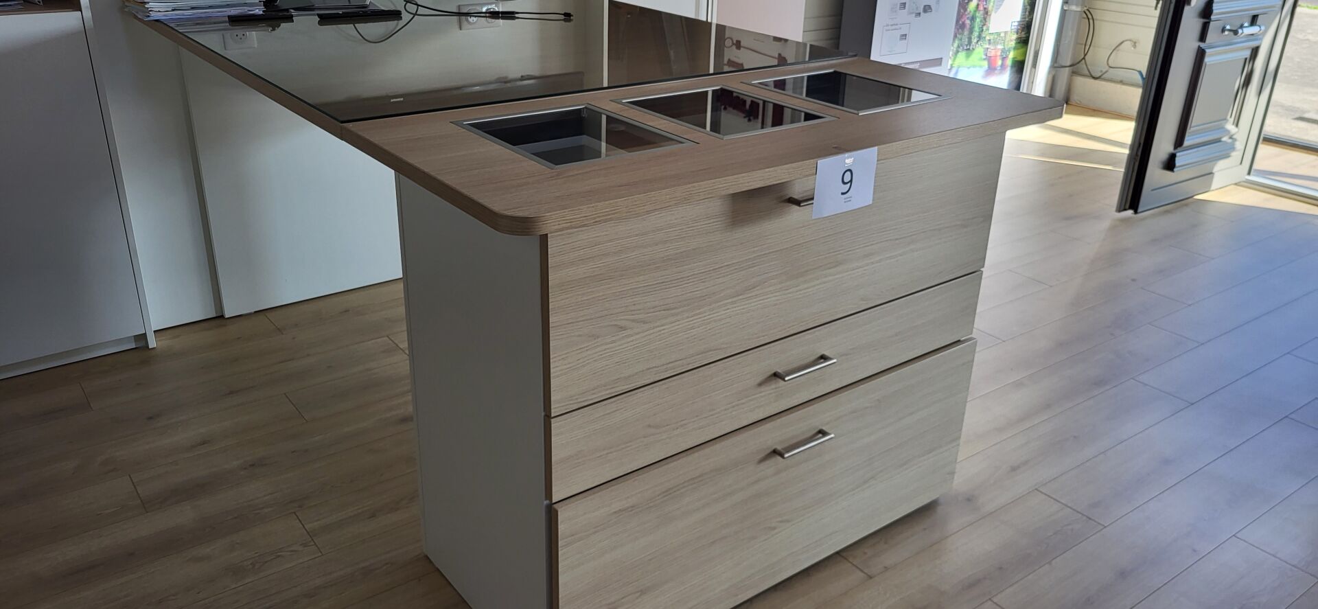 Vendu sur désignation le 23 10 2025 à 10h30, visible le 23/10/2025 à 9H à CARQUEFOU, enlèvement le 30/10/2025 de 9h à 12h, frais mise à disposition 10 € TTC par lot 1 îlot central 2 modules mélaminé façon bois et blanc, 3 tiroirs, 210x135cm