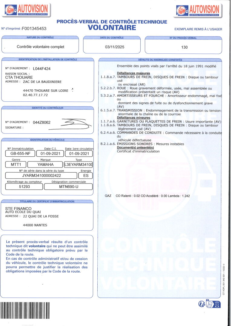 MOTO EQUIPEE D'ARCEAU MOTO ECOLE. 2 TROUS SUR LA SELLE PASSAGER- FROTTEMENT SUR L'ARCEAU AV. DEFAILLANCES MAJEURES: DISQUE OU TAMBOUR DE FREIN AR USE OU ENCRASSE- ROUE AV GRAVEMENT DEFORMEE OU MAL ASSEMBLEE- FUITE SUR L'AMORTISSEUR AV OU ENDOMMAGE- TENSION ANORMALE OU ENDOMMAGEE DE LA TRANSMISSION. DEFAILLANCES MINEURES: USURE IMPORTANTE DES GARNITURES OU PLAQUETTES DE FREIN AV- DISQUE OU TAMBOUR DE FREIN AV LEGEREMENT USES. COMMANDES NECESSAIRE A LA CONDUITE DEFECTUEUSE- MESURES INSTABLES DES EMISSIONS SONORES. FRAIS JUDICIAIRES 11.9 % HT