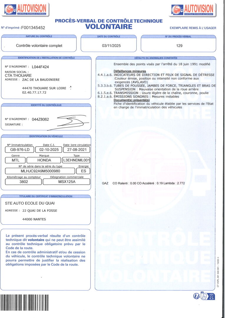 MOTO VENDUE AVEC FIV ET NUMERO DE FORMULE. DEFAILLANCES MINEURES: DEFAUT DE COULEUR EMISE DES CLIGNOTANTS AVG ET AVD- MAUVAISE ORIENTATION DE LA ROUE AR- USURE LEGERE DE LA TRANSMISSION- MESURE INSTABLE DES EMISSIONS SONORES. FRAIS JUDICIAIRES 11.9 % HT