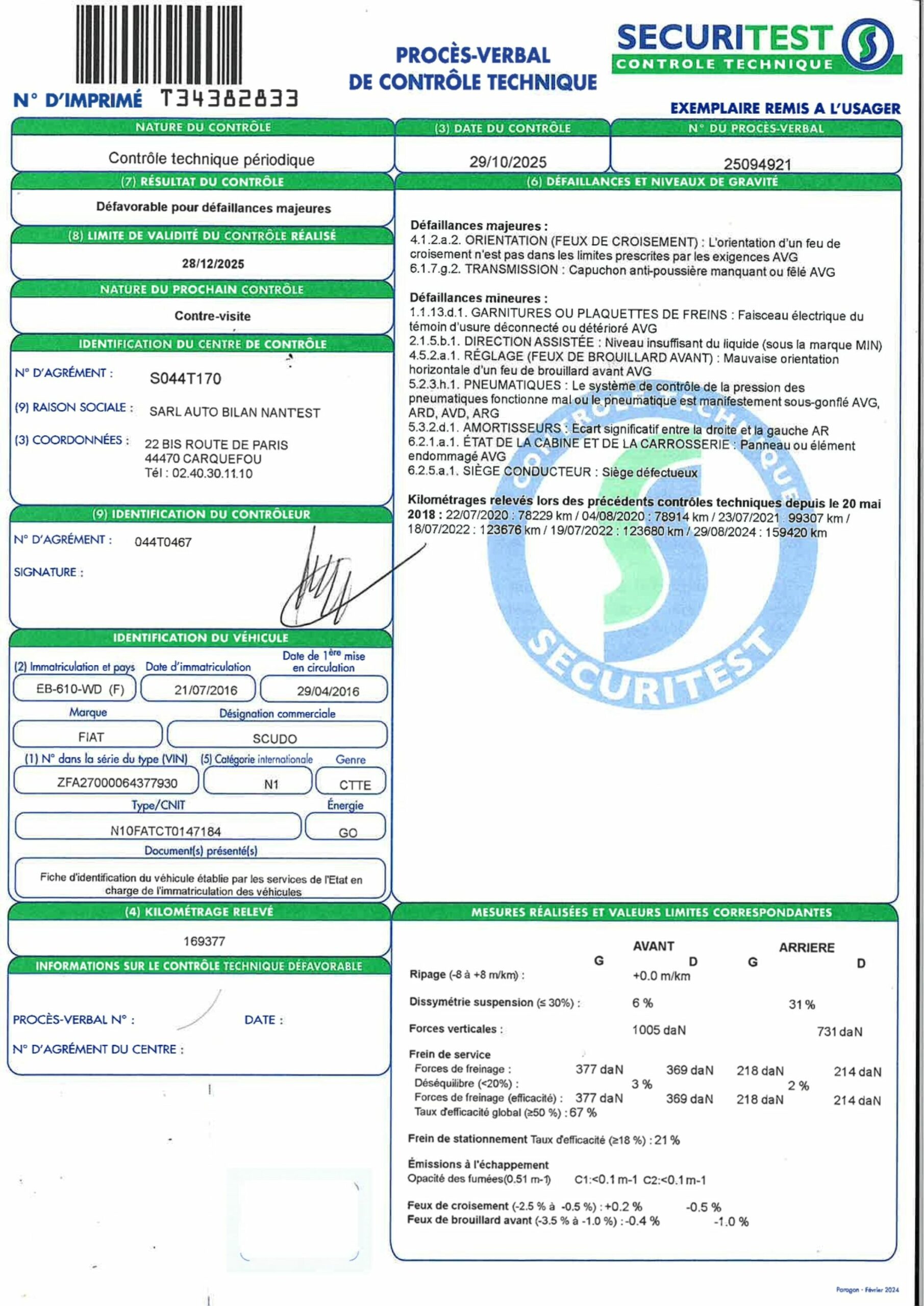 VEHICULE AVEC FIV ET NUMERO DE FORMULE. BVM5- CLIM- RADIO- VITRES ET RETROS ELECT- REGULATEUR DE VITESSES- RADAR DE RECUL- CAISSE BOIS- ATTELAGE REMORQUE- PUB ADH. SIEGES EN TISSU TACHES- SIEGE CONDUCTEUR DECHIRE- PLASTIQUES RAYES ET TACHES- TROU DANS LE SOL COTE CONDUCTEUR- MAUVAISE FIXATION DE LA PORTE DE LA BOITE A GANTS. PARE CHOCS AV CASSE- ENFONCEMENTS AILE AVG ET ARG- FROTTEMENTS SUR LE COTE D- PARE CHOCS AR DEBOITE. DEFAILLANCES MAJEURES: DEFAUT D'ORIENTATION DU FEU DE CROISEMENT AVG- CAPUCHON ANTI POUSSIERE DE LA TRANSMISSION MANQUANT. DEFAILLANCES MINEURES: FAISCEAU ELECTRIQUE DU TEMOIN D'USURE DU FREIN AVG DETERIORE- FUITE DU LIQUIDE DE LA DIRECTION ASSISTEE- MAUVAISE ORIENTATION DU FEU DE BROUILLARD AVG- 4 PNEUS SOUS GONFLES- CARROSSERIE AVG ENDOMMAGEE- SIEGE CONDUCTEUR DEFECTUEUX. FRAIS JUDICIAIRES 11.9 % HT
