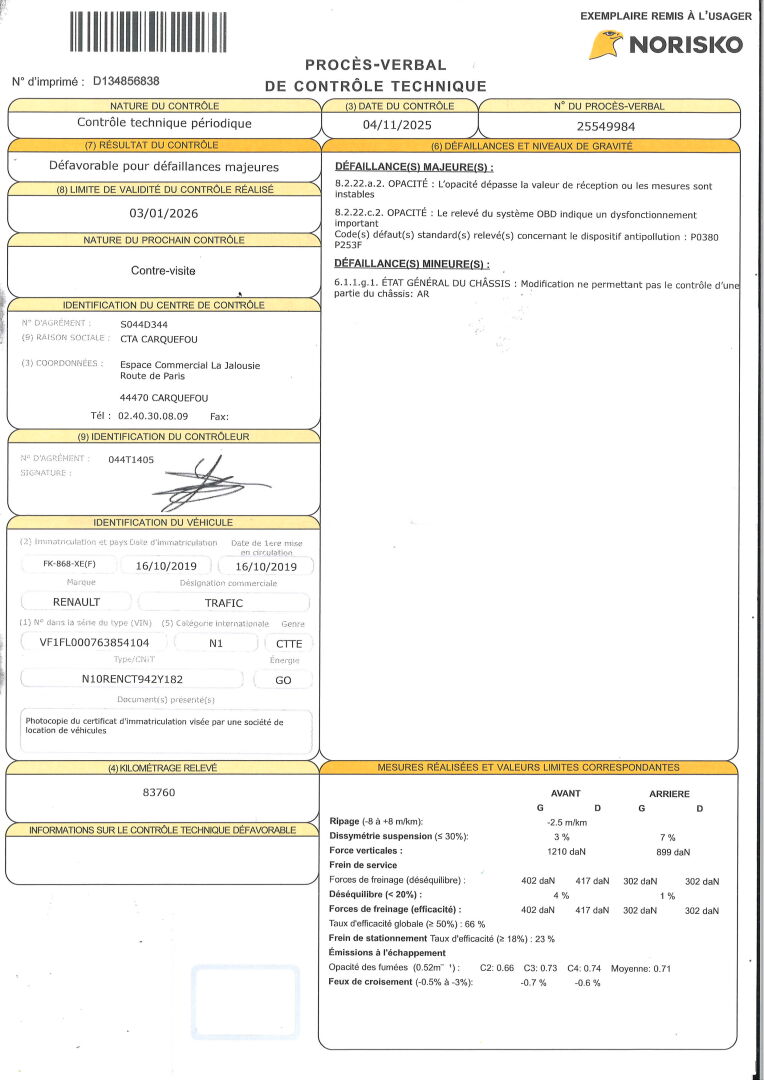 BVM6- CLIM- RADIO- GPS- VITRES ET RETROS ELECT- REGULATEUR DE VITESSES- CAISSE BOIS- ATTELAGE REMORQUE MIXTE- GALERIE AVEC ECHELLE- PUB ADH. VOYANT MOTEUR ALLUME- PLASTIQUES RAYES ET TACHES- SIEGES EN TISSU TACHES- SIEGE CONDUCTEUR DECHIRE. FROTTEMENTS PARE CHOCS AV ET IMPACT AVG- ENFONCEMENT PORTE AR- FEUX ARD CASSE. DEFAILLANCES MAJEURES: DEFAUT D'OPACITE. DEFAILLANCES MINEURES: MODIFICATION NE PERMETTANT PAS UNE PARTIE DU CHASSIS AR. FRAIS VOLONTAIRES 18 % HT