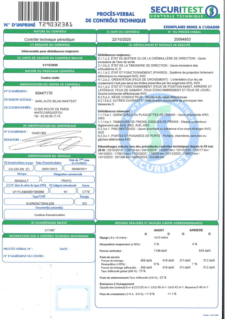 BVM- VITRES ET RETROS ELECT- ( CDE VITRE AVG HS)- RADIO- CAISSE BOIS AVEC RGT- GALERIE- PUB ADH. HABITACLE SALE ET TACHES- SIEGE CONDUCTEUR DECHIRE- SIEGES EN TISSU TACHES.HABITACLE SALE. NOMBREUX FROTTEMENTSET CHOCS- MANQUE LA TRAPPE A CARBURANT, ENJOLIVEUR ARG ET ARD- PARE CHOCS AR CASSE- FEU ARD CASSE LA VITRE AVG NE FERME PAS- DIFFICULTEE POUR OUVRIR ET FERMER LA PORTE LAT- MANQUE LA PROTECTION DE LA PORTE AVD. DEFAILLANCES MAJEURES: USURE EXCESSIVE DE L'AXE DE SORTIE DU BOITIER OU DE LA CREMAILLERE DE DIRECTION- USURE EXCESSIVE DES ARTICULATIONS G ET D DE LA TIMONERIE DE DIRECTION- ECLAIRAGE AVG ET AVD DEFECTUEUX- SIEGE CONDUCTEUR DEFECTUEUX- DETERIORATION DE LA PORTE D. DEFAILLANCES MINEURES: USURE IMPORTANTE DES GARNITURES OU PLAQUETTES DE FREINS ARD ET ARG- DISQUES OU TAMBOURS DE FREINS ARG, ARD, AVG ET AVD LEGEREMENT USES- PNEU AVG ET AVD USES. FRAIS JUDICIAIRES 11.9 % HT