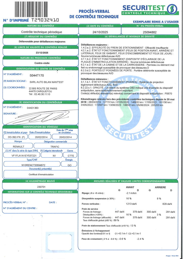 BVM6- CLIM- RADIO- VITRES ET RETROS ELECT- REGULATEUR DE VITESSES- CAISSE BOIS AVEC RGT-GALERIE- PUB ADH. SIEGES EN TISSU TACHES- SIEGE CONDUCTEUR DECHIRE- PLASTIQUES RAYES ET TACHES- MANQUE PARE SOLEIL ET SA FIXATION COTE CONDUCTEUR. RAYURES D'USAGE- MANQUE PROTECTION PORTE AVD- FEU ARD CASSE. DEFAILLANCES MAJEURES: EFFICACITE INSUFFISANTE DU FREIN DE STATIONNEMENT- DEFAUT D'ECLAIRAGE DU FEU AVD ET DE LA PLAQUE D'IMMAT AR- CARROSSERIE D ENDOMMAGEE- PORTE AVD DETERIOREE. DEFAILLANCES MINEURES: ECLAIRAGE AVD ET AVG DEFECTUEUX- DEFAUT D'OPACITE. FRAIS JUDICIAIRES 11.9 % HT