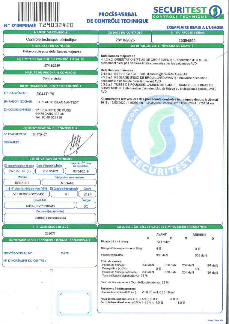 BVA- CLIM- RADIO- GPS- 4 VITRES ELECT- RETROS ELECT RABAT- REGULATEUR DE VITESSES. PLASTIQUES RAYES ET TACHES- SIEGES EN TISSU TACHES. RAYURES D'USAGE- FROTTEMENT SUR LE PARE CHOCS AR, AV ET RETRO D. DEFAILLANCES MAJEURES: DEFAUT D'ORIENTATION DU FEU DE CROISEMENT AVD. DEFAILLANCES MINEURES: BALAI D'ESSUIE GLACE AR DEFECTUEUX- MAUVAISE ORIENTATION DU FEUX DE BROUILLARD AVG- DETERIORATION D'UN SILENBLOC DE LIAISON AU CHASSIS OU A L'ESSIEU AVG ET AVD. FRAIS JUDICIAIRES 11.9 % HT
