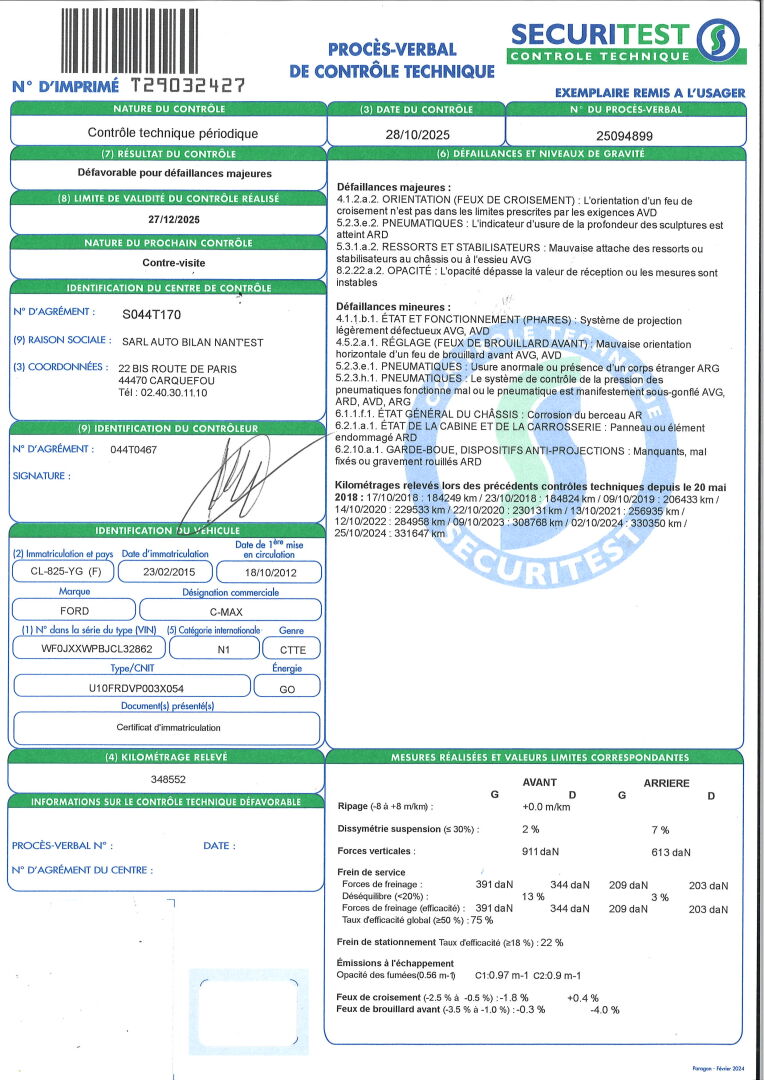 BVM6- CLIM BI ZONES- RADIO- 4 VITRES ELECT- RETROS ELECT- REGULATEUR DE VITESSES. SIEGES EN TISSU TACHES- PLASTIQUES RAYES ET TACHES- TROU DANS LE PLANCHER COTE CONDUCTEUR. FROTTEMENTS SUR LE PARE CHOCS AV, AR, AILE ARD ET PORTE ARD- TRACES DE CORROSION. DEFAILLANCES MAJEURES: DEFAUT D'ORIENTATION DU FEUX DE CROISEMENT AVD- PNEU ARD USE- MAUVAISE ATTACHE DES RESSORTS OU STABILISATEUR AU CHASSIS OU A L'ESSIEU AVG- DEFAUT D'OPACITE. DEFAILLANCES MINEURES: DEFAUT D'ECLAIRAGE DES FEUX AVG ET AVD- MAUVAISES ORIENTATION DES FEUX DE BROUILLARD AVG ET AVD- USURE ANORMALE DU PNEU ARG- 4 PNEUS SOUS GONFLES- CORROSION DU BERCEAU AR- CARROSSERIE ARD ENDOMMAGEE. FRAIS JUDICIAIRES 11.9 % HT