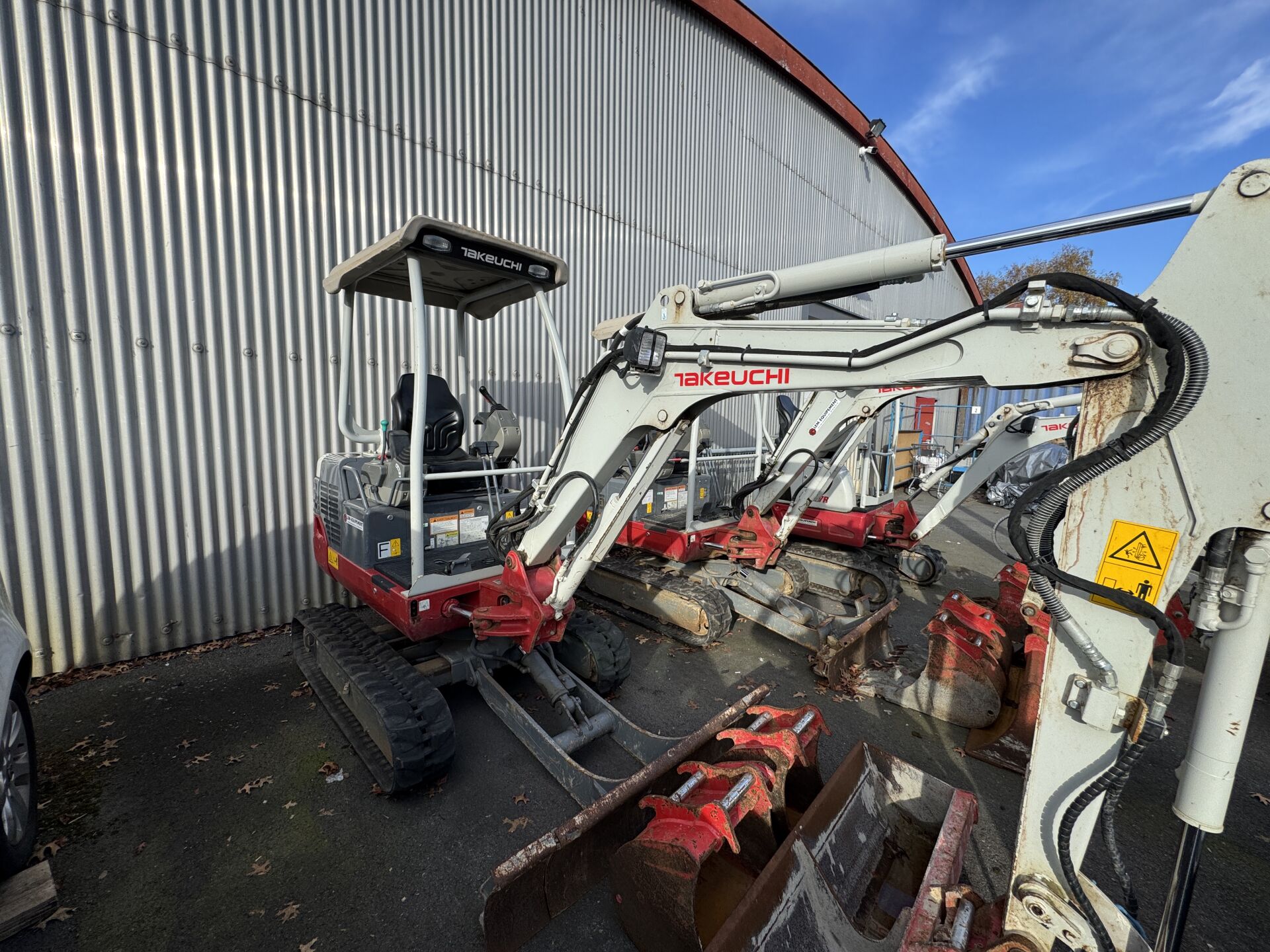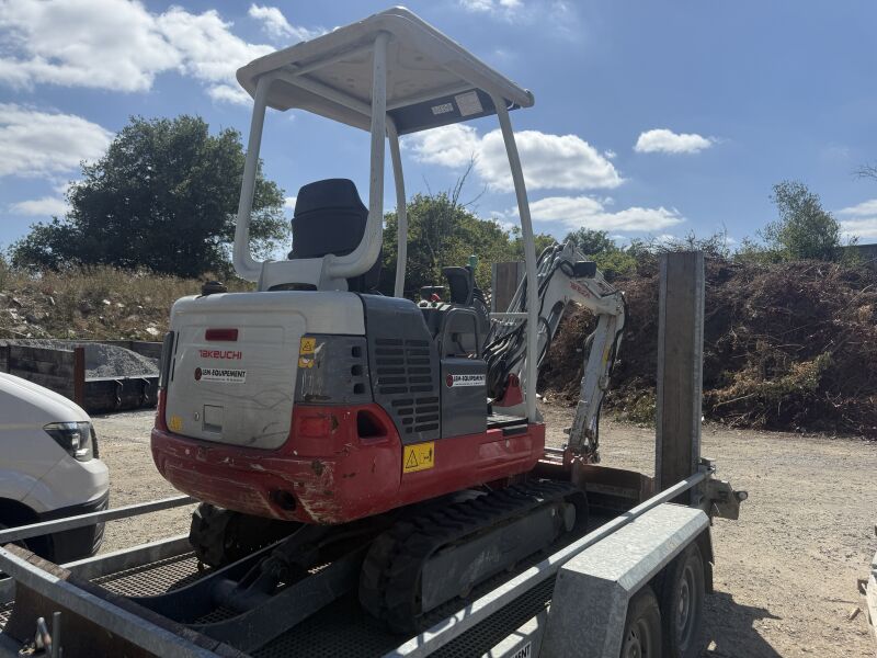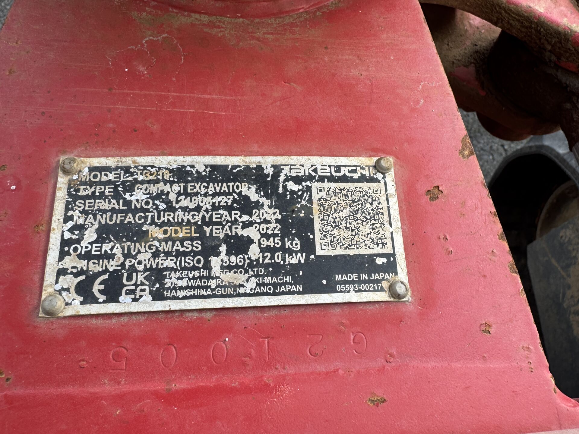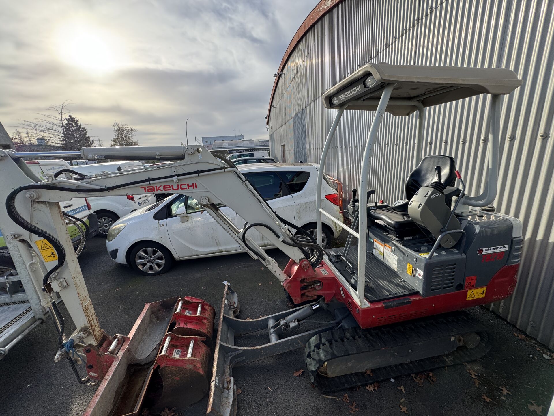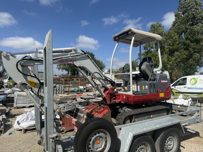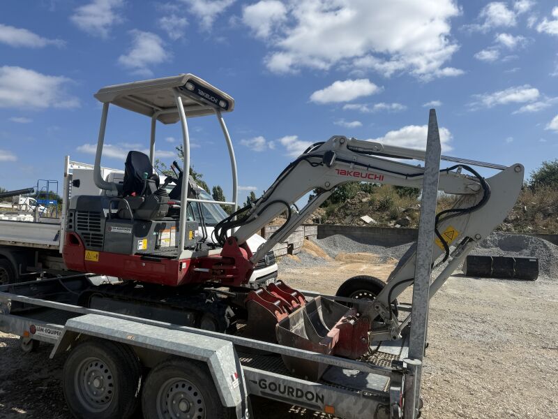 1 mini pelle TAKEUCHI sur chenille caoutchouc modèle TB219S n°121905127, de 2021 compteur = 522 heures avec 3 godets MARTIN de 300, 450 et 1200 mm et lame de 1000 à allonges et attache rapide MARTIN VENDU SANS LA REMORQUE- VENDU SANS CLE- PREVOIR UN BOOSTER. FRAIS VOLONTAIRES 18 % HT