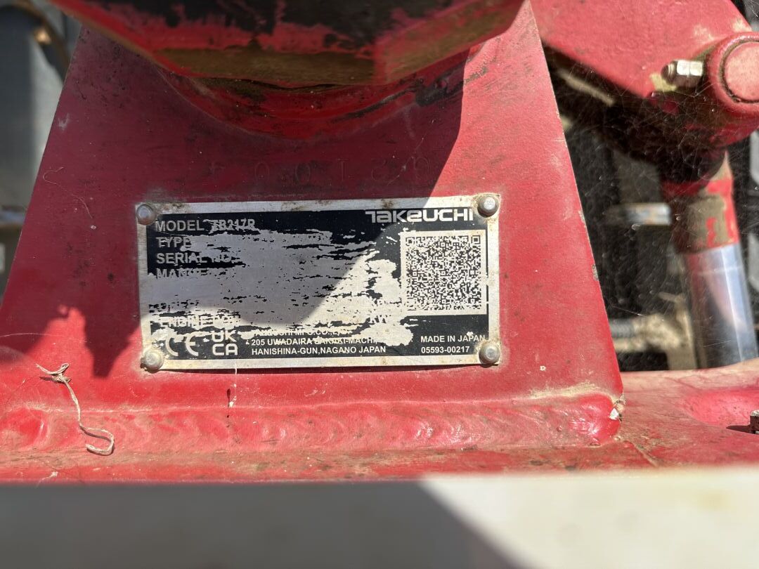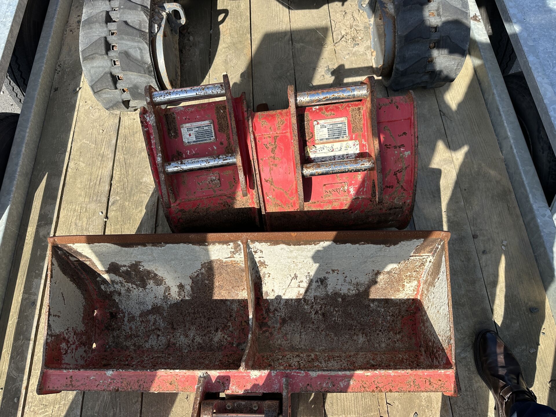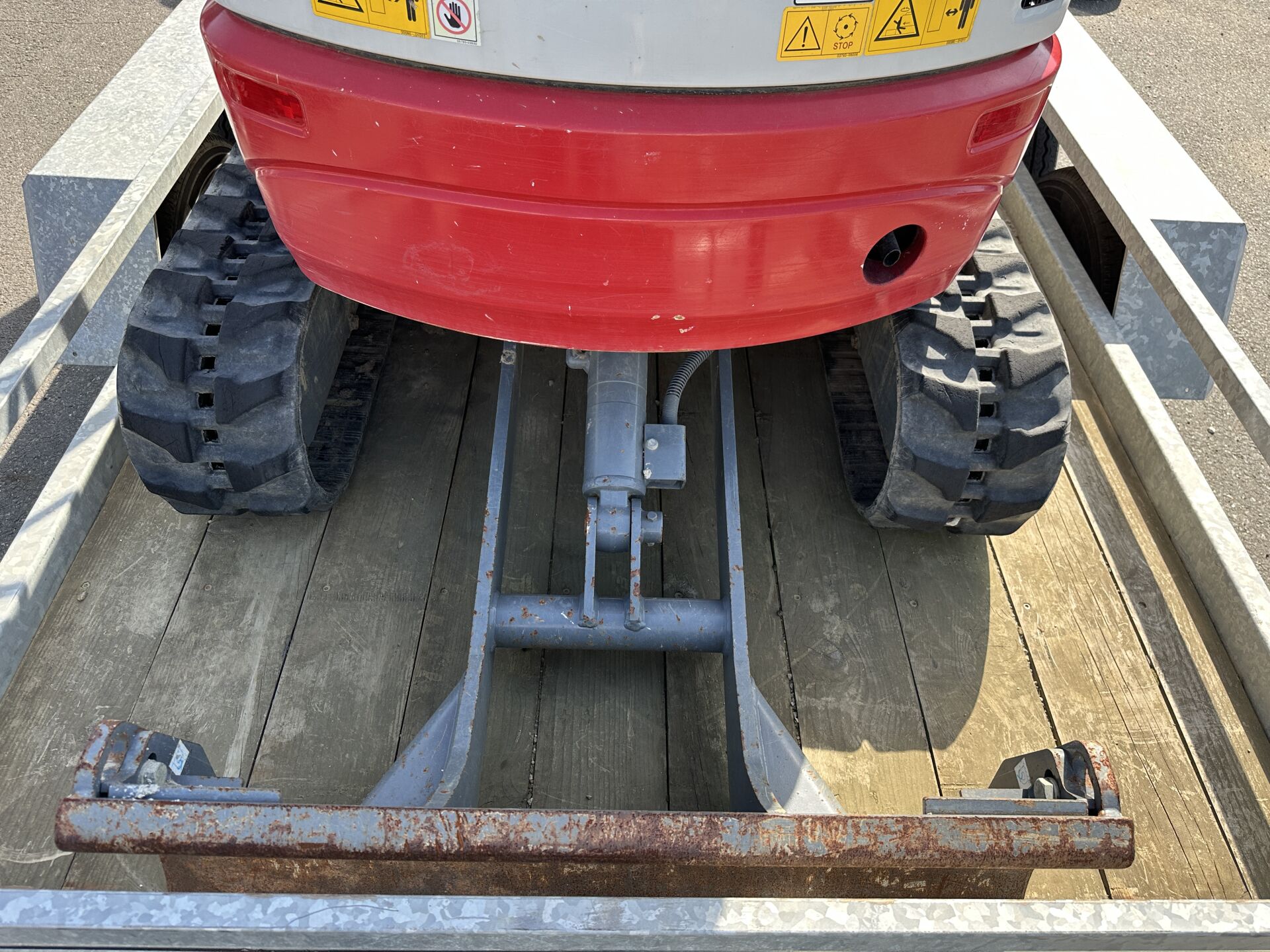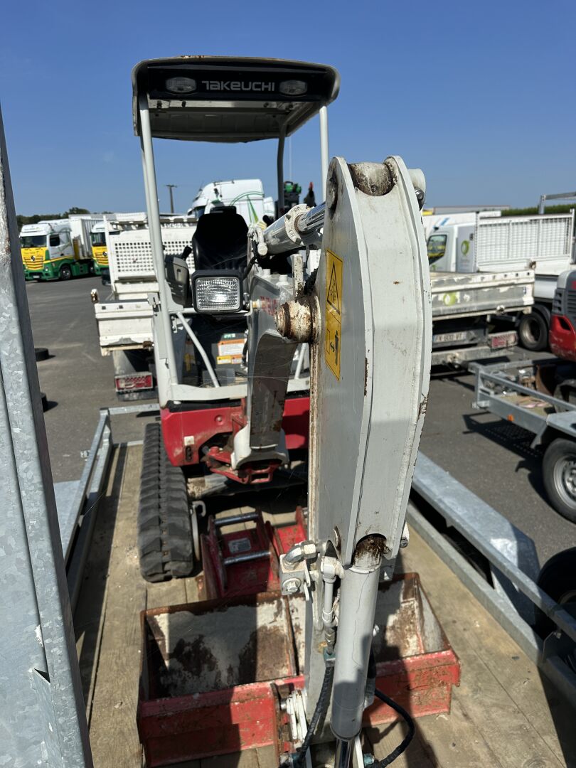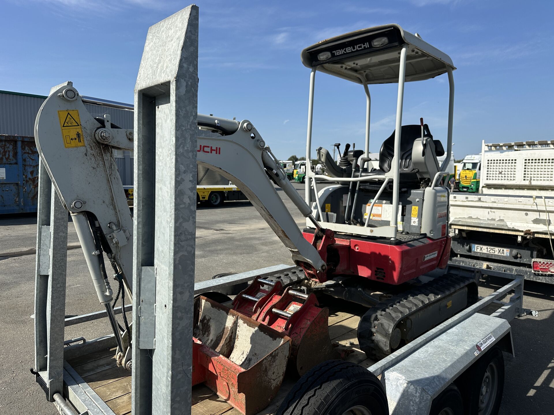 1 mini pelle TAKEUCHI sur chenille caoutchouc modèle TB217R n°215005322, de 2021 compteur = 509 heures avec 3 godets MARTIN de 300, 450 et 1000 mm et lame de 1000 et attache rapide MARTIN VENDU SANS LA REMORQUE- VENDU SANS CLE- PREVOIR UN BOOSTER. FRAIS VOLONTAIRES 18 % HT