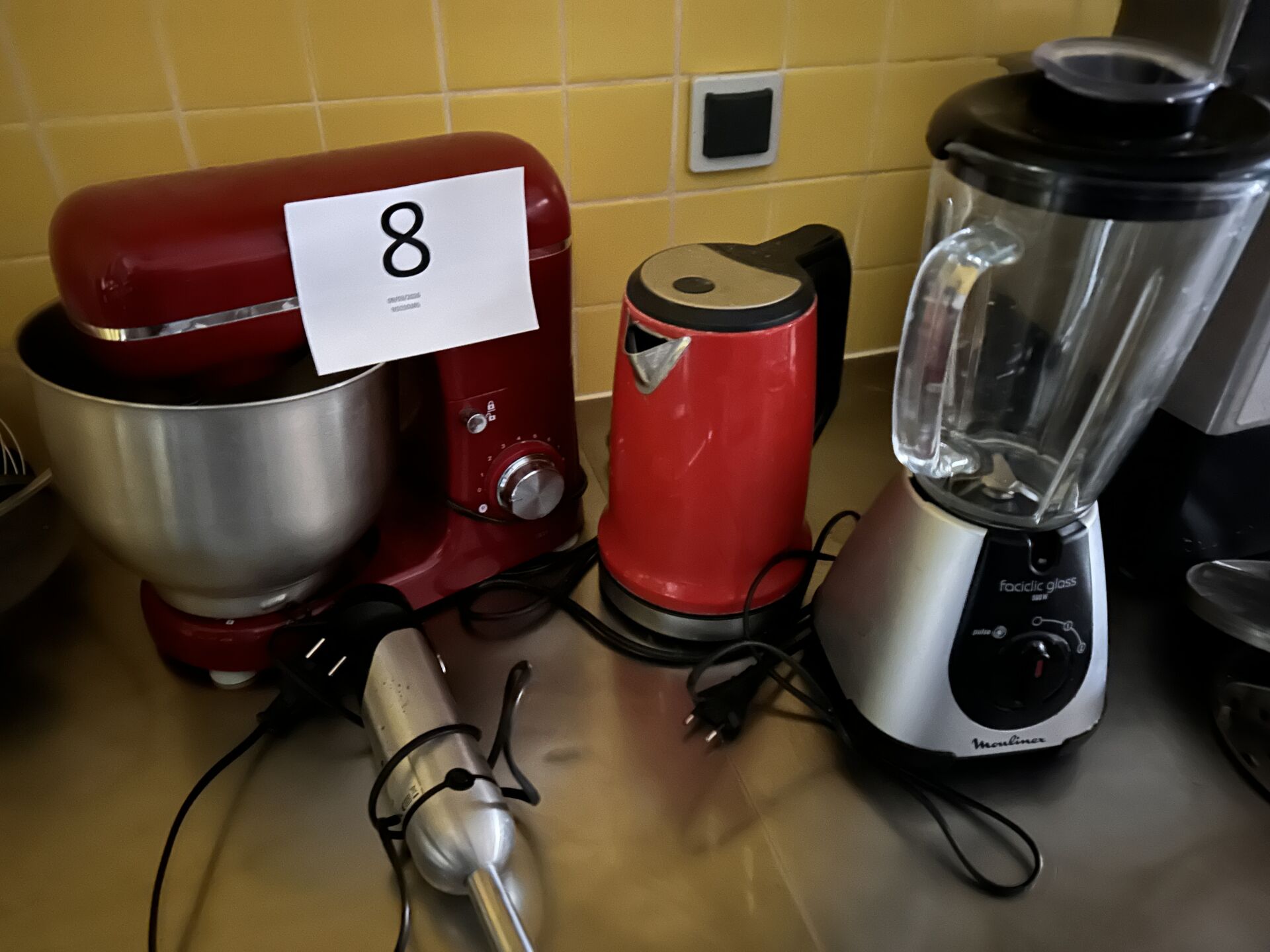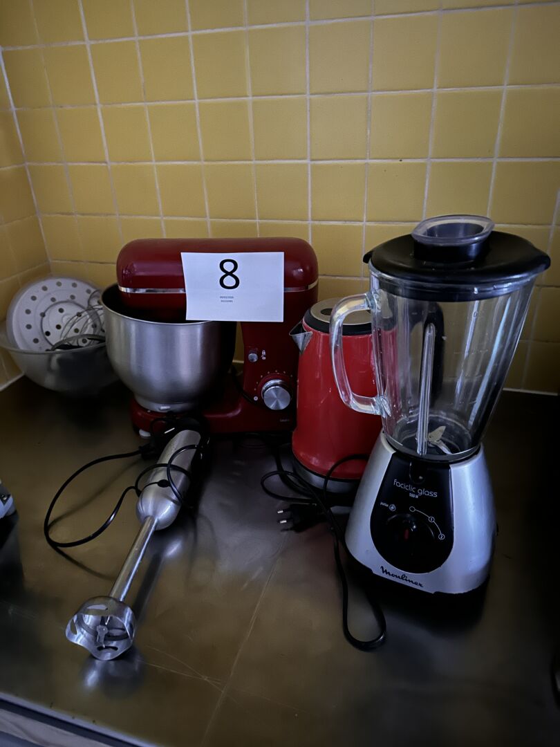 1 ensemble comprenant : 1 bouilloire SILVERCREST rouge 1 robot batteur SILVERCREST et accessoires 1 blender MOULINEX FACICLIC GLASS, 1 batteur plongeant BATSCHER