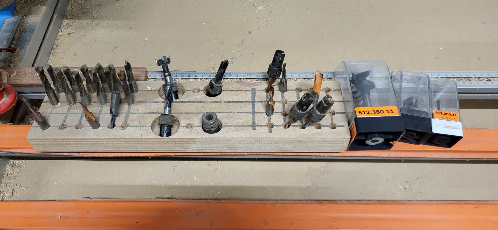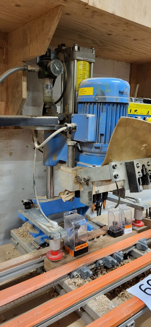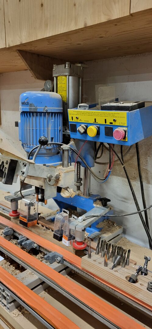 1 perceuse multibroches HETTICH type Blue Max 8 FS n°6275, de 2001 avec accessoires dans son meuble avec amenage sur rails alu (380 x 34 cm)