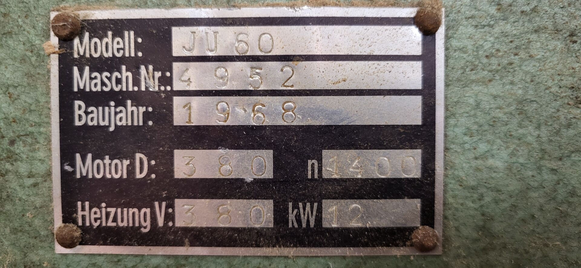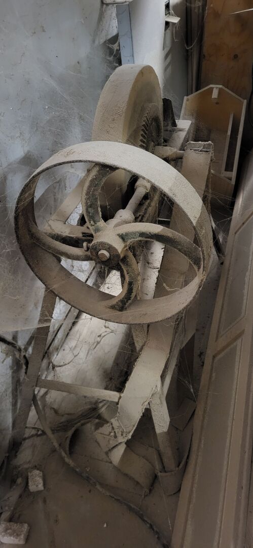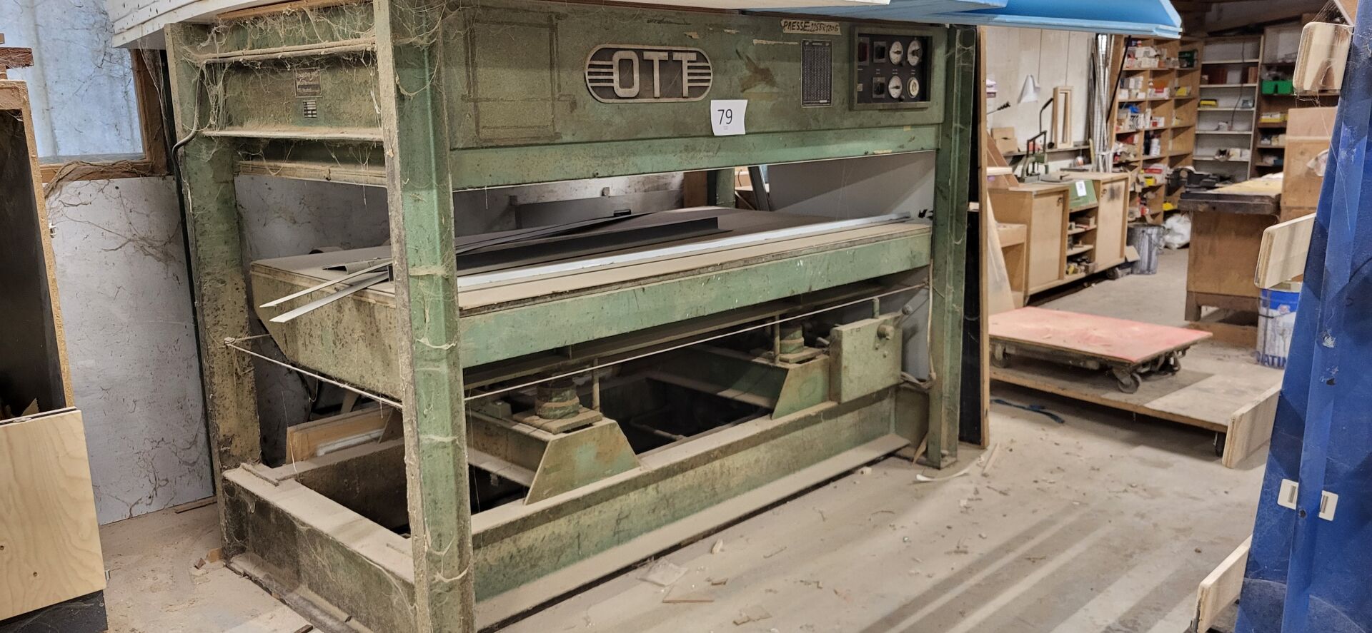 1 presse à plaquer OTT modèle JU 60 n°4952, de 1968, 258 x 132 x 180 cm, on y joint 1 meule à aiguiser manuelle (ancienne)