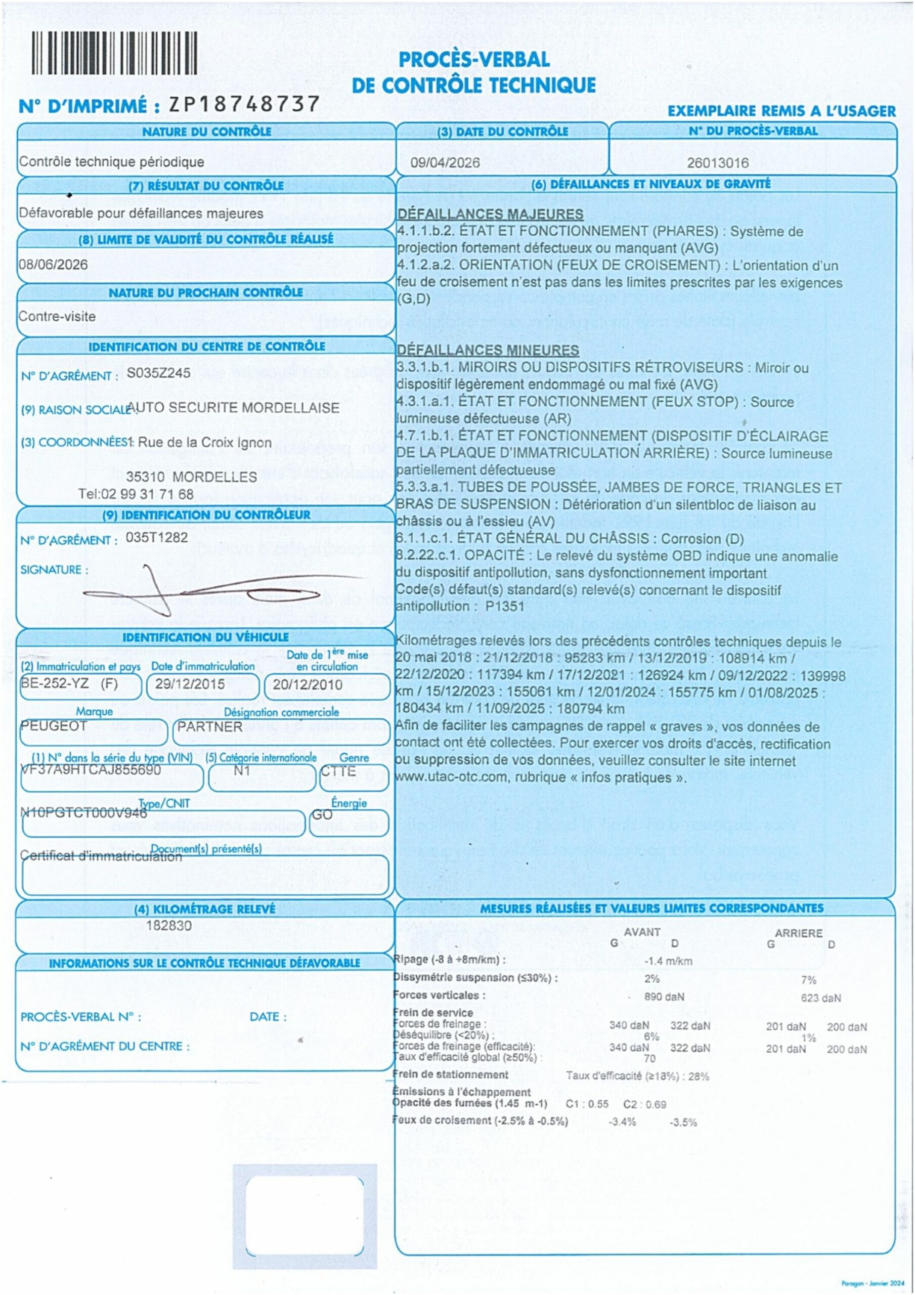 BOITE MANUELLE 5 VITESSES VITRES ET RETRO ELECTRIQUES SIEGES TISSU NOIR (TACHES) SERIGRAPHIE FROTTEMENTS DEFAILLANCES MAJEURES : PHARES SYST DE PROJECTION FORTEMENT DEFECTUEUX AVG MAUVAISE ORIENTATION DES FEUX DE CROISEMENT DEFAILLANCES MINEURES : RETRO ENDOMMAGE OU MAL FIXE AVG FEUX STOP DEFECTUEUX AR ECLAIRAGE DE LA PLAQUE DEFECTUEUX DETERIORATION D'UN SILENTBLOC DE LIAISON AU CHASSIS OU A L'ESSIEU AV ETAT GENERAL DU CHASSIS : CORROSION OBD INDIQUE UNE ANOMALIE DU SYSTEME ANTIPOLLUTION