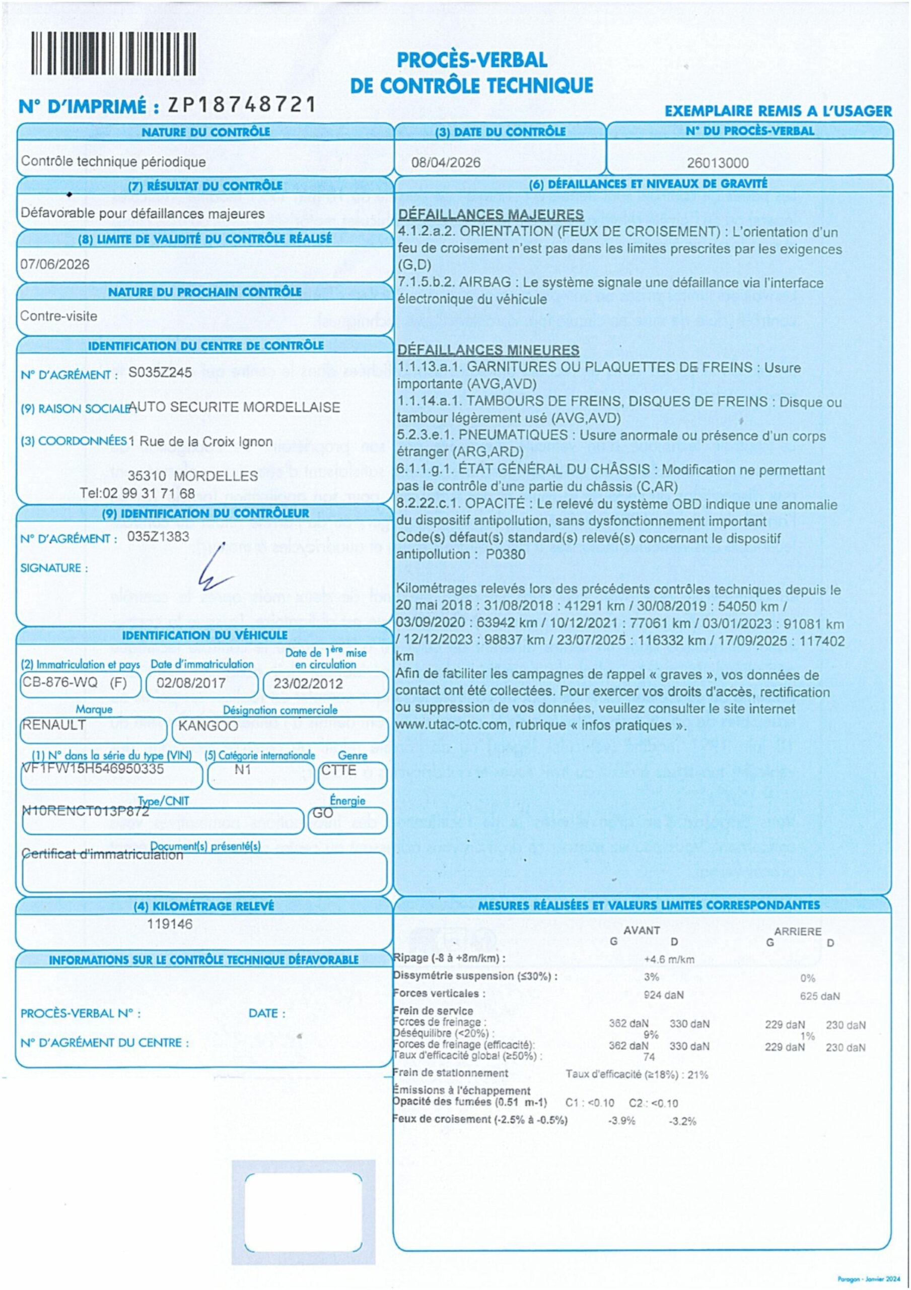BOITE MANUELLE 5 VITESSES VITRES ET RETRO ELECTRIQUES BARRE DE TOIT SIEGES TISSU NOIR (TACHES) FROTTEMENTS ROUILLE DEFFAILLANCES MAJEURES : MAUVAISE ORIENTATION DES FEUX DE CROISEMENT DEFAILLANCE DU SYSTEME AIRBAG DEFAILLANCES MINEURES : GARNITURES OU PLAQUETTES DE FREINS USURE IMPORTANTE AVG AVD DISQUES OU TAMBOURS DE FREINS LEGEREMENT USES AVG AVD PNEUS USURE ANORMALE OU PRESENCE D'UN CORPS ETRANGER ARG ARD MODIFICATION N EPERMETTANT PAS LE CONTROLE D'UNE PARTIE DU CHASSIS OBD INDIQUE UNE ANOMALIE DU SYST ANTI POLLUTION