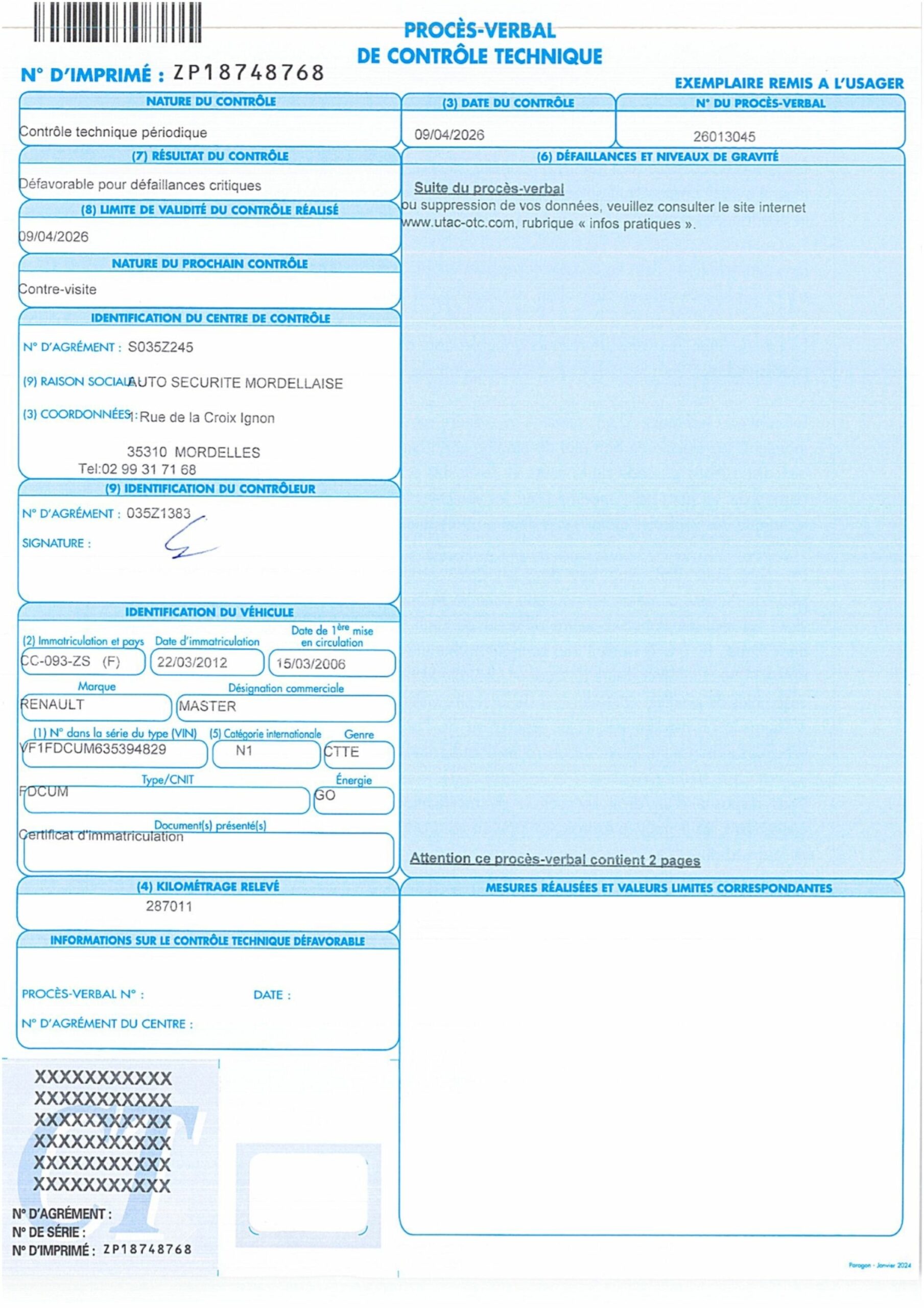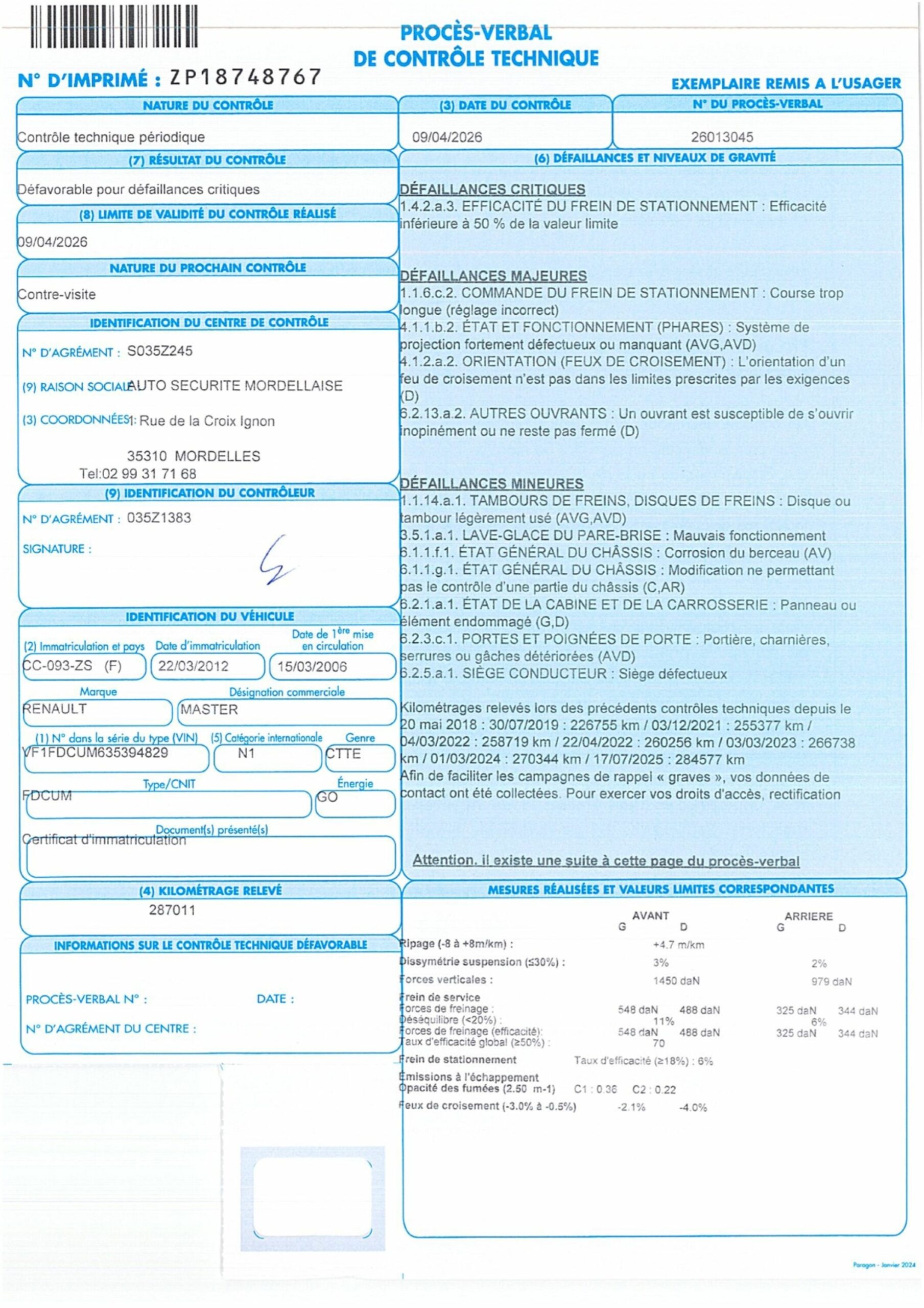 ENLEVEMENT SUR PLATEAU OBLIGATOIRE BOITE MANUELLE 6 VITESSES VITRES ET RETRO ELECTRIQUES REHAUSSE / RALLONGE CLIMATISATION ATTELAGE SERIGRAPHIE FROTTEMENTS, ENFONCEMENTS DEFAILLANCES CRITIQUES : FREIN DE STATIONNEMENT EFFICACITE INFERIEURE A 50% DE LA VALEUR LIMITE DEFAILLANCES MAJEURES : COMMANDE FREIN DE STATIONNEMENT COURSE TROP LONGUE PHARES SYSTEME DE PROJECTION DEFECTUEUX OU MANQUANT AVG AVD MUVAISE ORIENTATION DES FEUX DE CROISEMENT UN OUVRANT EST SUSCEPTIBLE DE S'OUVRIR INOPINEMENT DEFAILLANCES MINEURES : DISQUES OU TAMBOURS DE FREINS LEGEREMENT USES AVG AVD MAUVAIS FONCTIONNEMENT DU LAVE GLACE CHASSIS CORROSION AU BERCEAU AV MODIFICATION NE PERMETTANT PAS LE CONTROLE D'UNE PARTIE DU CHASSIS PANNEAU OU ELEMENT DE LA CABINE ENDOMMAGE PORTES POIGNEES OU GACHES DETERIOREES AVD SIEGE CONDUCTEUR DEFECTUEUX