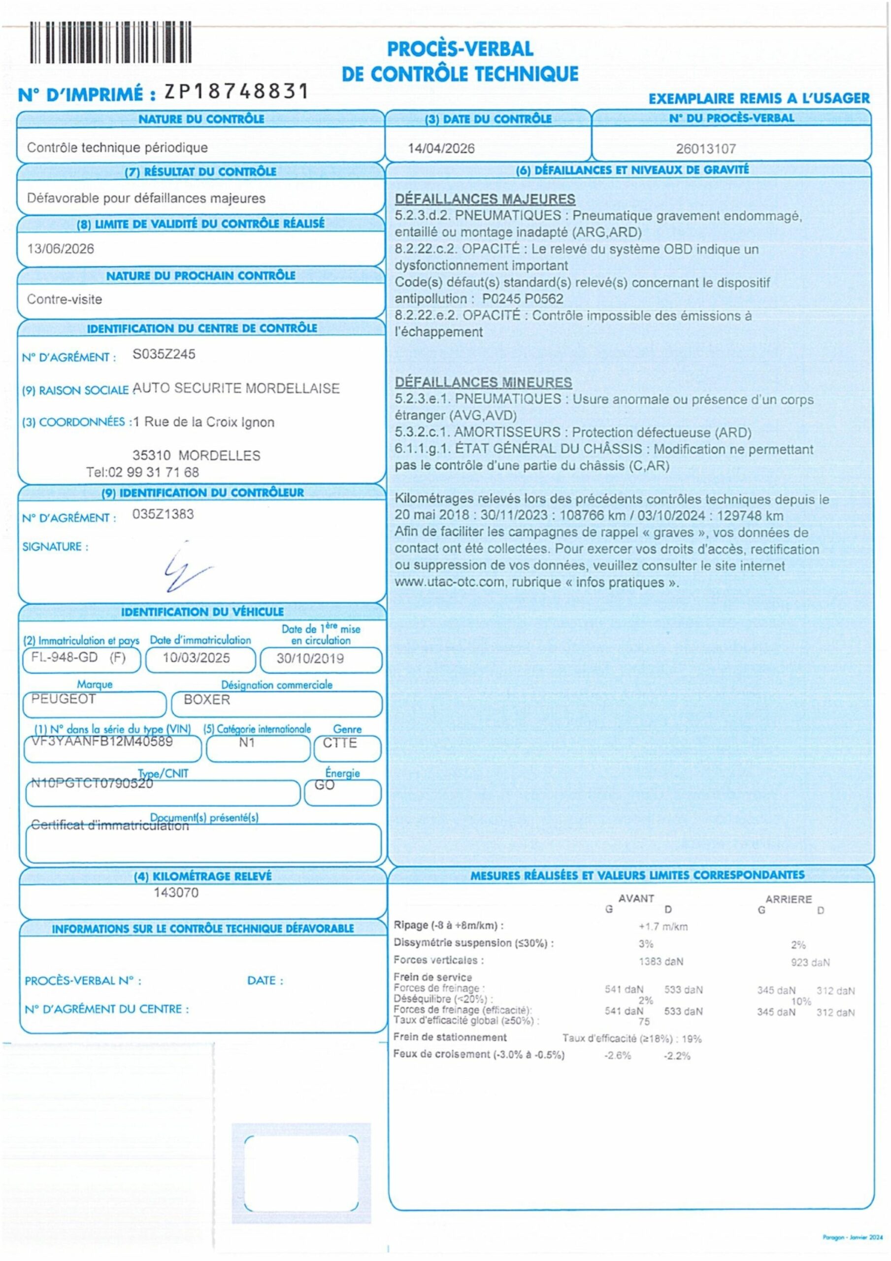 BOITE MANUELLE 6 VITESSES VITRES ET RETRO ELECTRIQUES CLIMATISATION RADAR AR SIEGES TISSU NOIR SERIGRAPHIE DEFAILLANCES MAJEURES / PNEUS GRAVEMENT ENDOMMAGE, ENTAILLE OU MONTAGE INADAPTE ARG ARD OPACITE : OBD INDIQUE UN DYSFONCTIONNEMENT IMPORTANT CONTROLE IMPOSSIBLE DES EMISSIONS A L'ECHAPPEMENT DEFAILLANCES MINEURES : PNEUS USURE IMPORTANTE OU PRESENCE D'UN CORPS ETRANGER AVG AVD AMORTISSEURS PROTECTION DEFECTUEUSE ARD MODIFICATION NE PERMETTANT PAS LE CONTROLE DU PARTIE DU CHASSIS