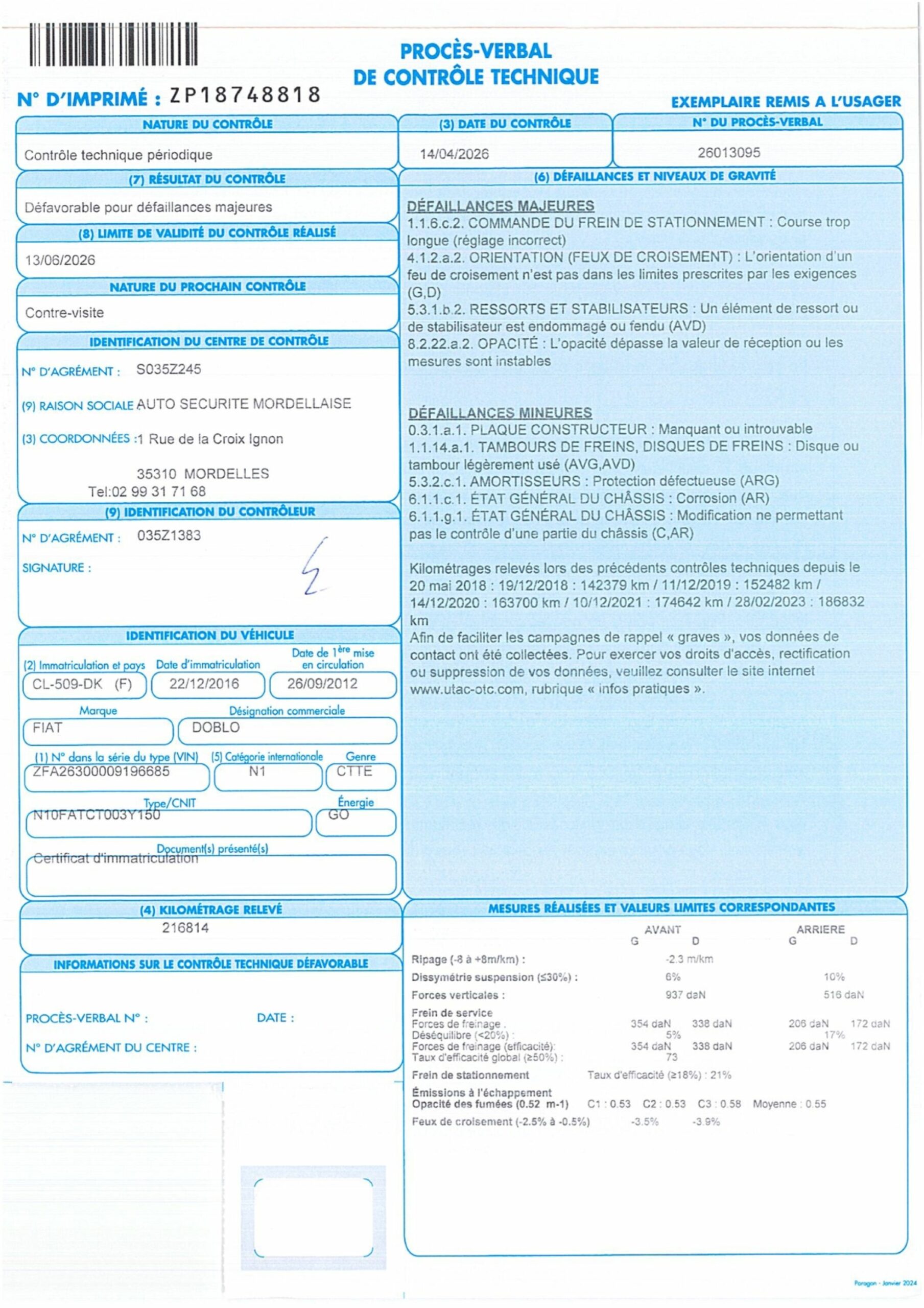 BOITE MANUELLE 5 VITESSES VITRES ET RETRO ELECTRIQUES PORTE LATERALE DROITE SIEGES TISSU ROUGE ET NOIR CHOCS FROTTEMENTS MOISISSURES DEFAILLANCES MAJEURES : FREIN DE STATIONNEMENT COURSE TROP LONGUE MAUVAISE ORIENTATION DES FEUX DE CROISEMENT ELEMENT DE RESSORT OU DE STABILISATEUR ENDOMMAGE OU FENDU OPACITE DEPASSE LA VALEUR DE RECEPTION DEFAILLANCES MINEURES : PLAQUE CONSTRUSCTEUR MANQUANTE OU INTROUVABLE DISQUES OU TAMBOURS DE FREINS LEGEREMENT USES AMORTISSEURS PROTECTION DEFECTUEUSE CHASSIS CORROSION MODIFICATION E PERMATTANT PAS LE CONTROLE D'UNE PARTIE DU CHASSIS