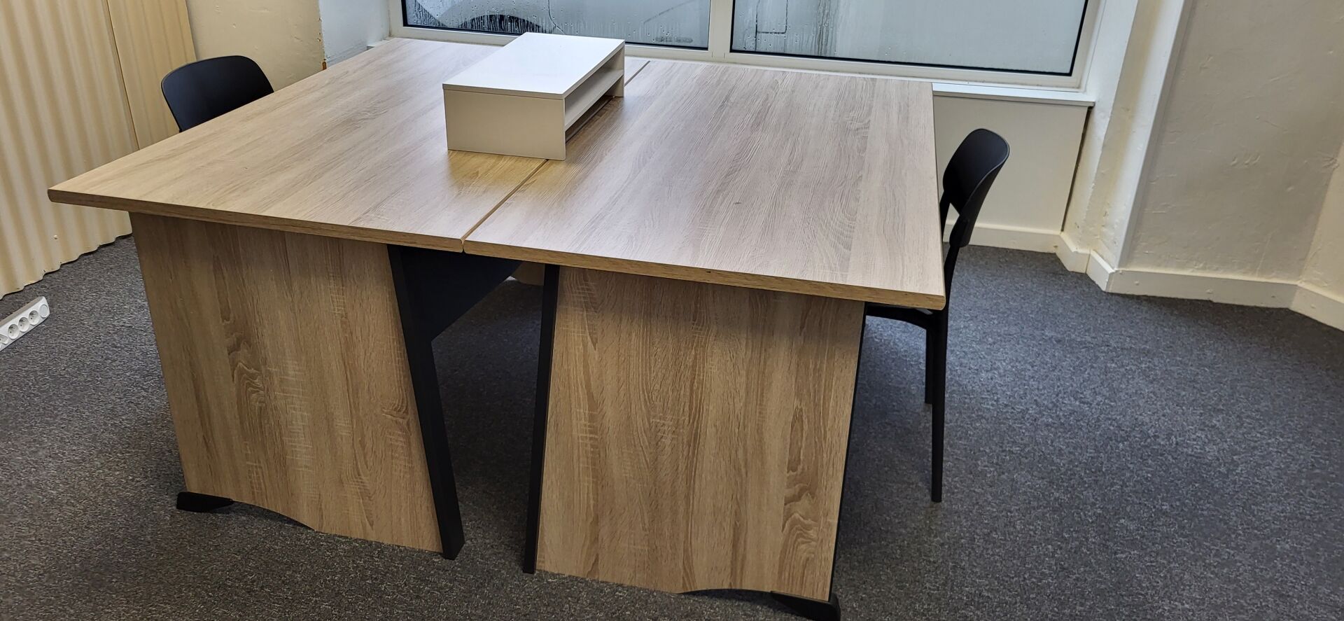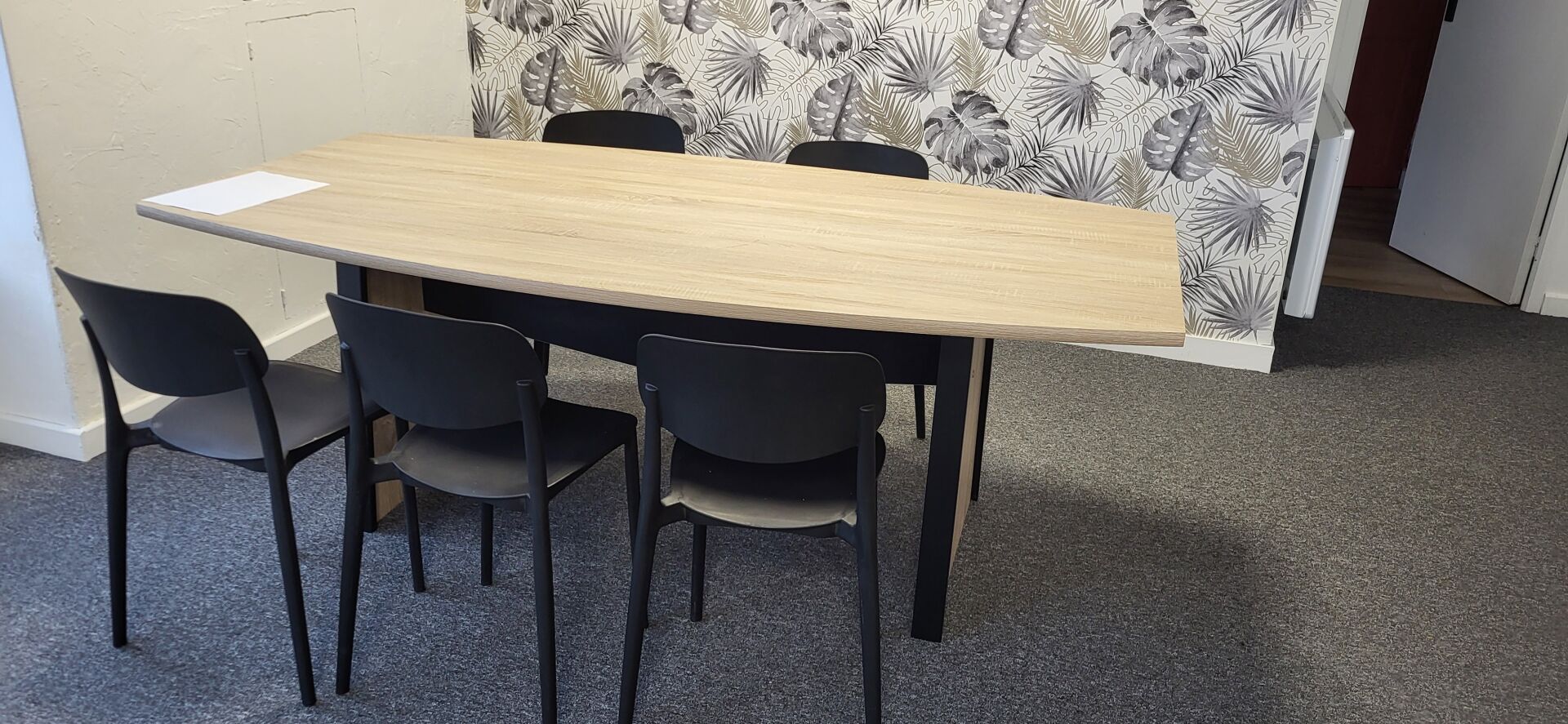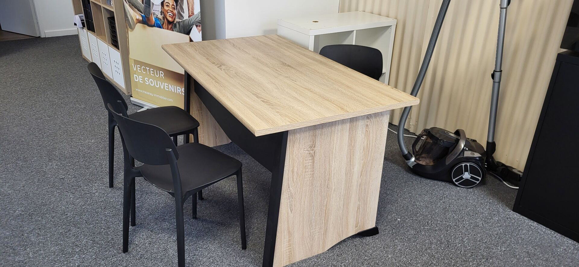 Ensemble de mobilier comprenant : 2 fauteuils assises coque pvc noir Table basse en bois naturel DIAM. / 40 CM Pendule en pvc doré Meuble bas en bois laqué beige à 1 vantail et 2 tiroirs 3 bureaux en mélaminé façon bois et noir, 140x80 cm et 1 bureau assorti 205x105 cm 10 chaises en pvc noir Armoire basse en métal laqué noir à 2 vantaux 80x40x90 cm Étagère en mélaminé blanc à 4 niches mobiles Étagère en mélaminé façon bois à 12 niches 147x40x112 cm Rampe lumineuse en bois naturel 4 lumières (démontée) On joint : Lot de décorations, décorations de Noël