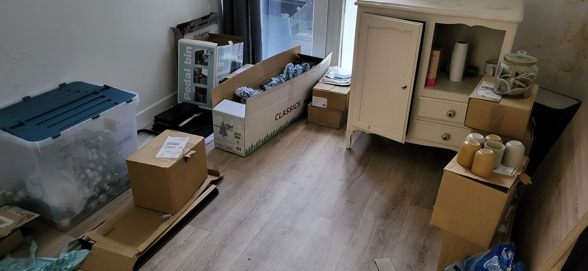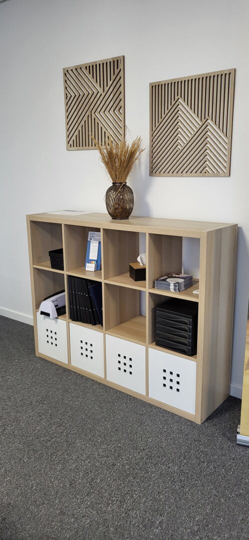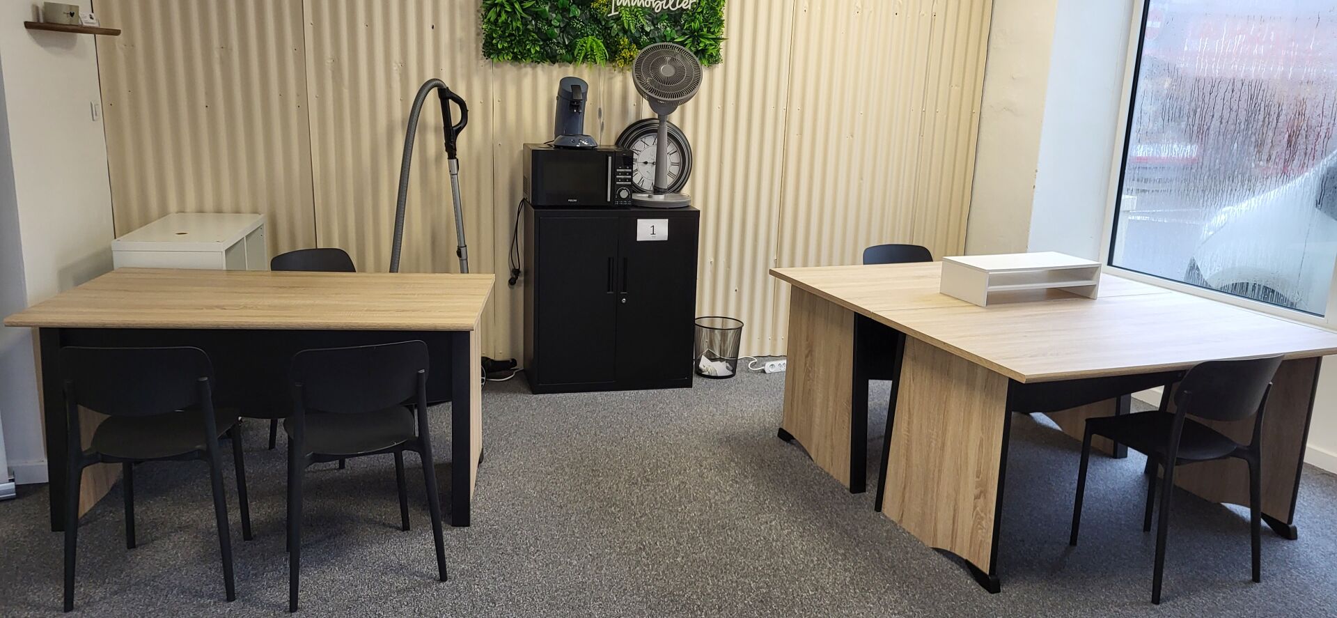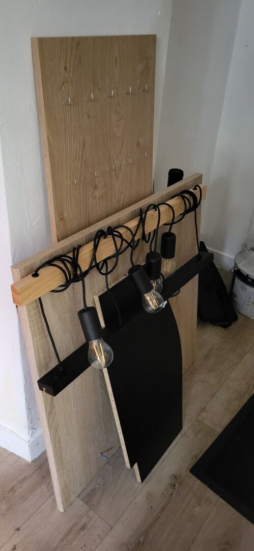 Ensemble de mobilier comprenant : 2 fauteuils assises coque pvc noir Table basse en bois naturel DIAM. / 40 CM Pendule en pvc doré Meuble bas en bois laqué beige à 1 vantail et 2 tiroirs 3 bureaux en mélaminé façon bois et noir, 140x80 cm et 1 bureau assorti 205x105 cm 10 chaises en pvc noir Armoire basse en métal laqué noir à 2 vantaux 80x40x90 cm Étagère en mélaminé blanc à 4 niches mobiles Étagère en mélaminé façon bois à 12 niches 147x40x112 cm Rampe lumineuse en bois naturel 4 lumières (démontée) On joint : Lot de décorations, décorations de Noël
