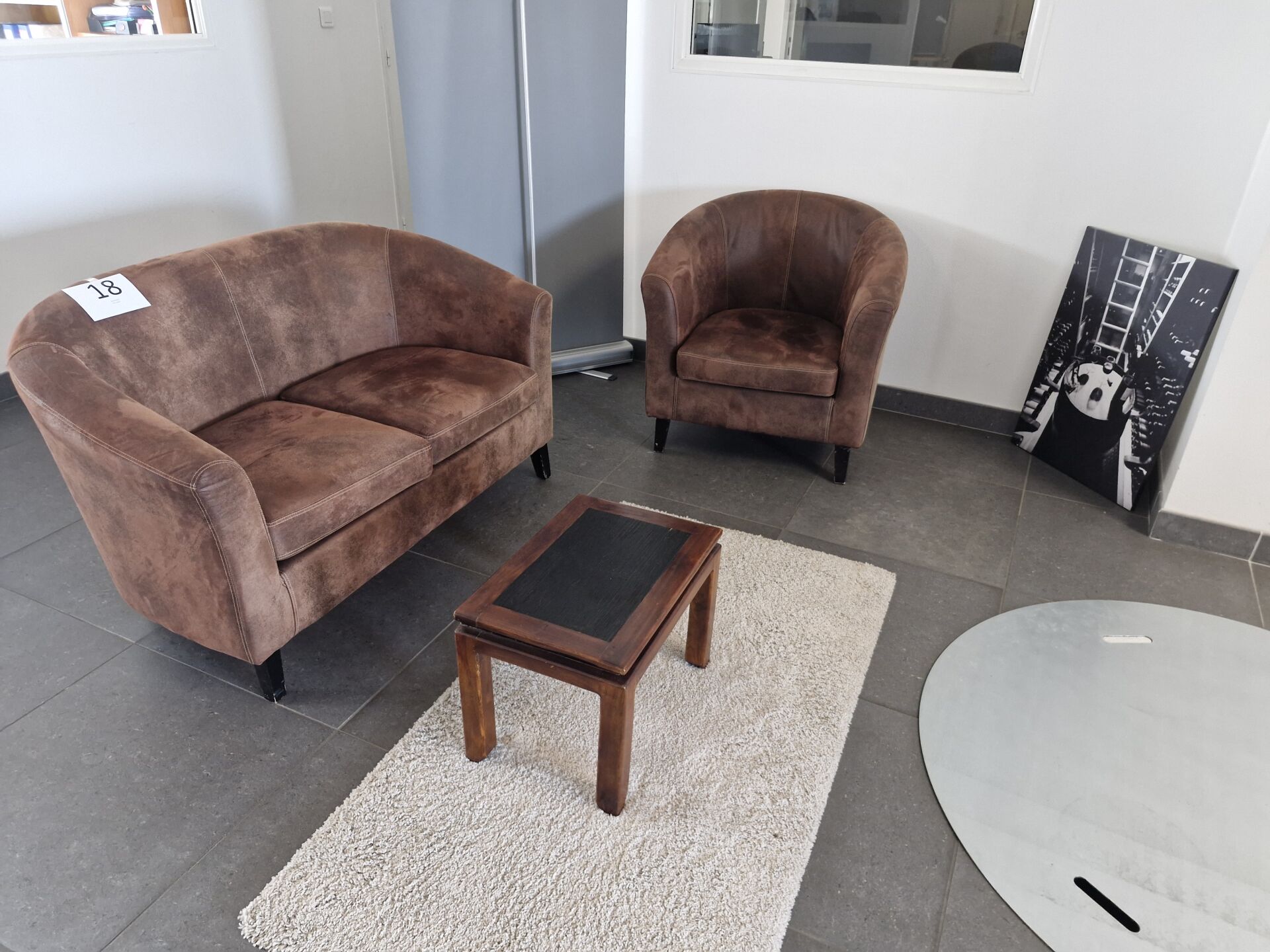 1 canapé club 2 places façon daim marron 1 fauteuil club façon daim marron 1 table basse bois exotique 50 x 35 cm 1 tapis tissu gris 150 x 80 cm 1 plante d'intérieur (Strelitzia)