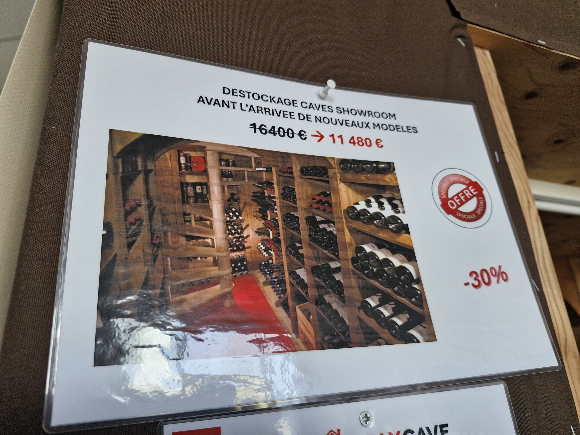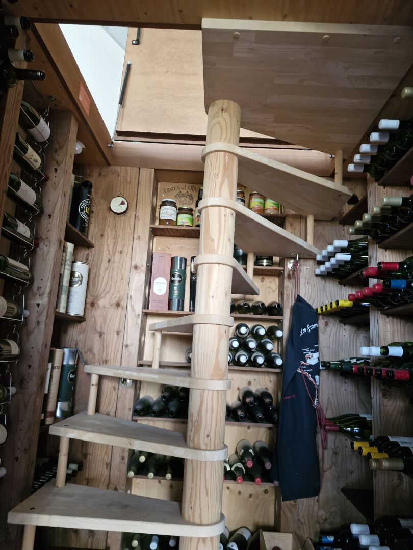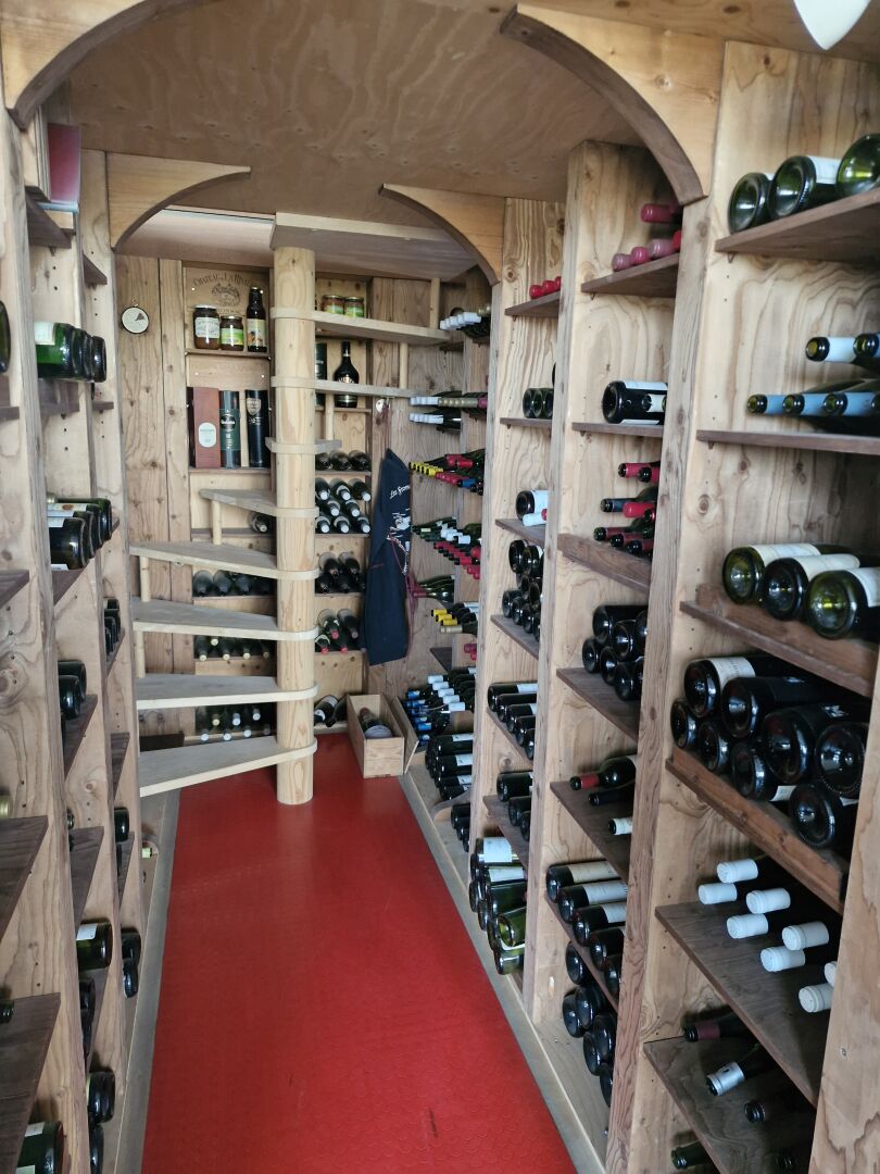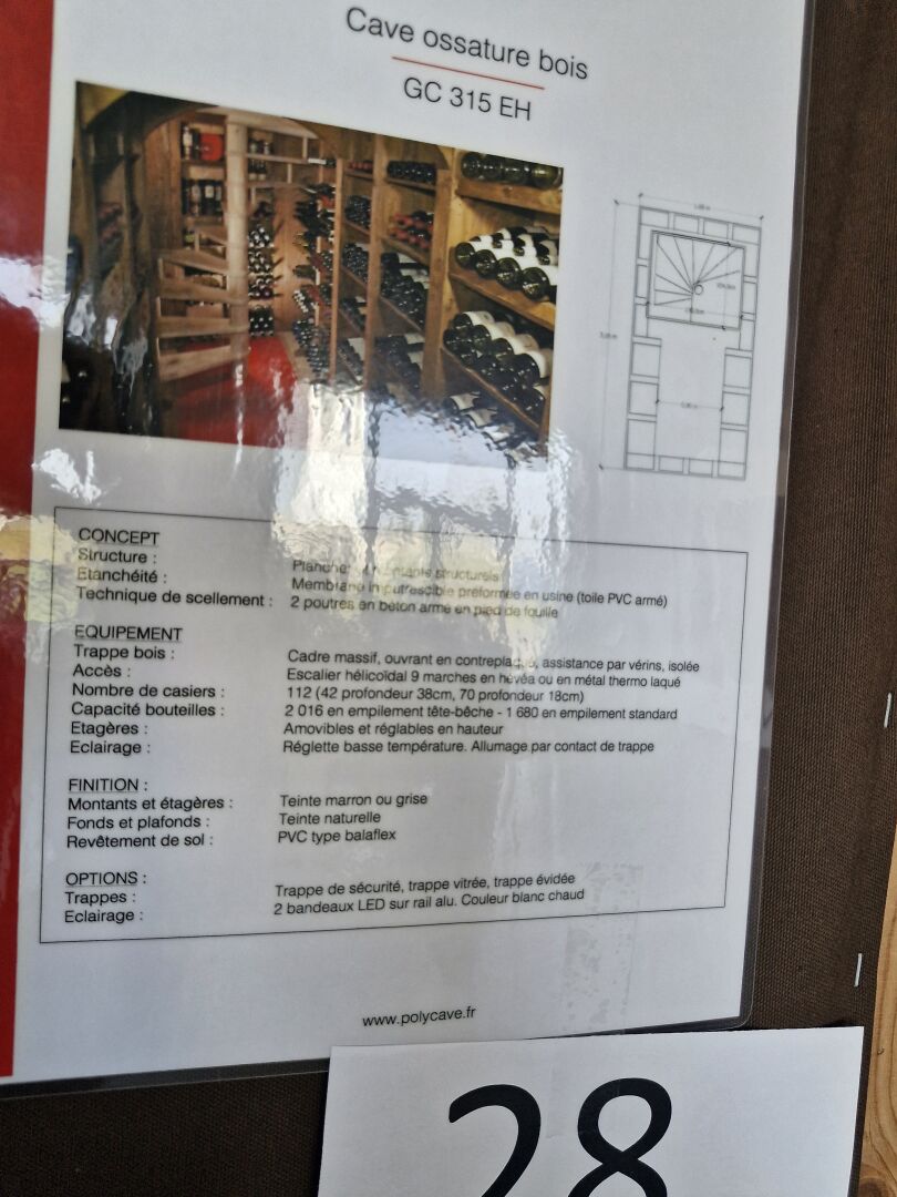 1 cave ossature bois GC 315EH, rectangulaire 316 x168 x 214 cm, trappe en bois, escalier en colimaçon bois, 9 marches, 88 casiers, sans climatiseur vendue vide, à démonter pour enlèvement Note : l'acheteur des caves et casiers sera en charge de jeter les bouteilles vides servant de décoration dans la benne prévue à cet effet