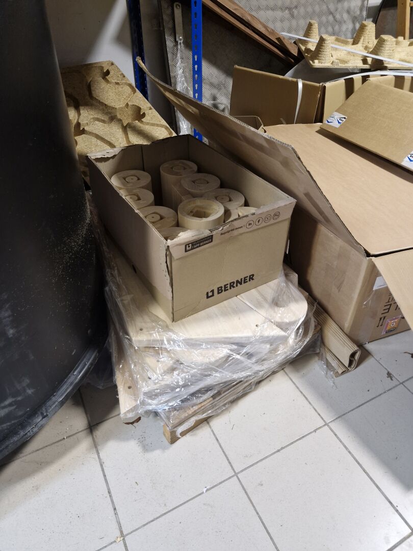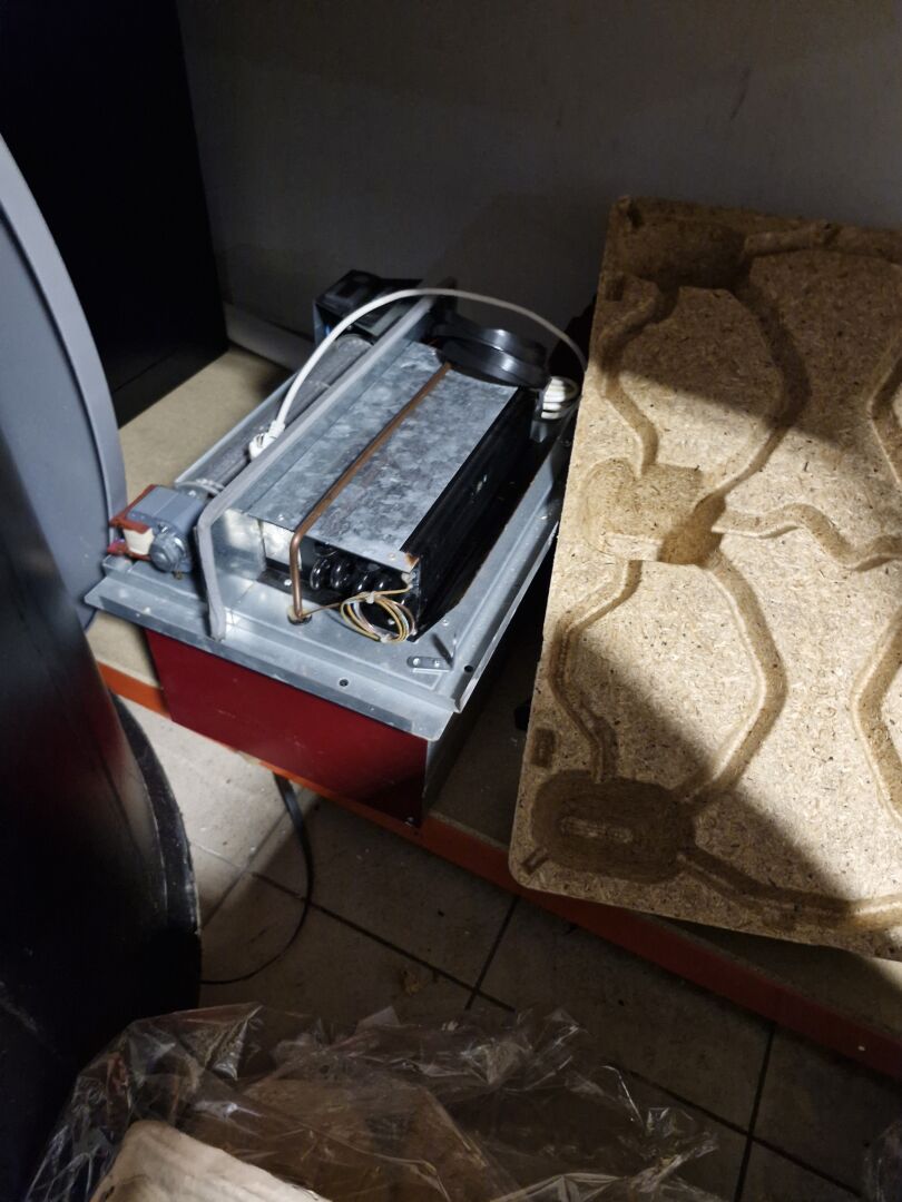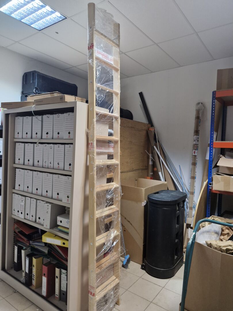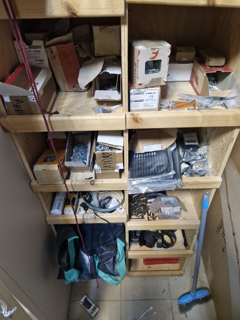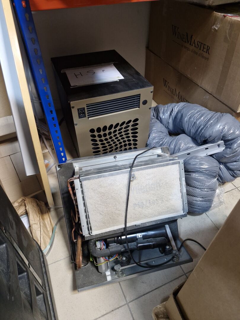 1 stock d'accessoires pour la construction de caves (quincaillerie, échelles de meunier, tube cylindrique pour cave enterrée, climatiseurs de cave, éléments d'escalier bois hélocoïdaux, éléments de structures métal, mini-centrale hydraulique DANA TP3 ... 1 lot de fatras divers