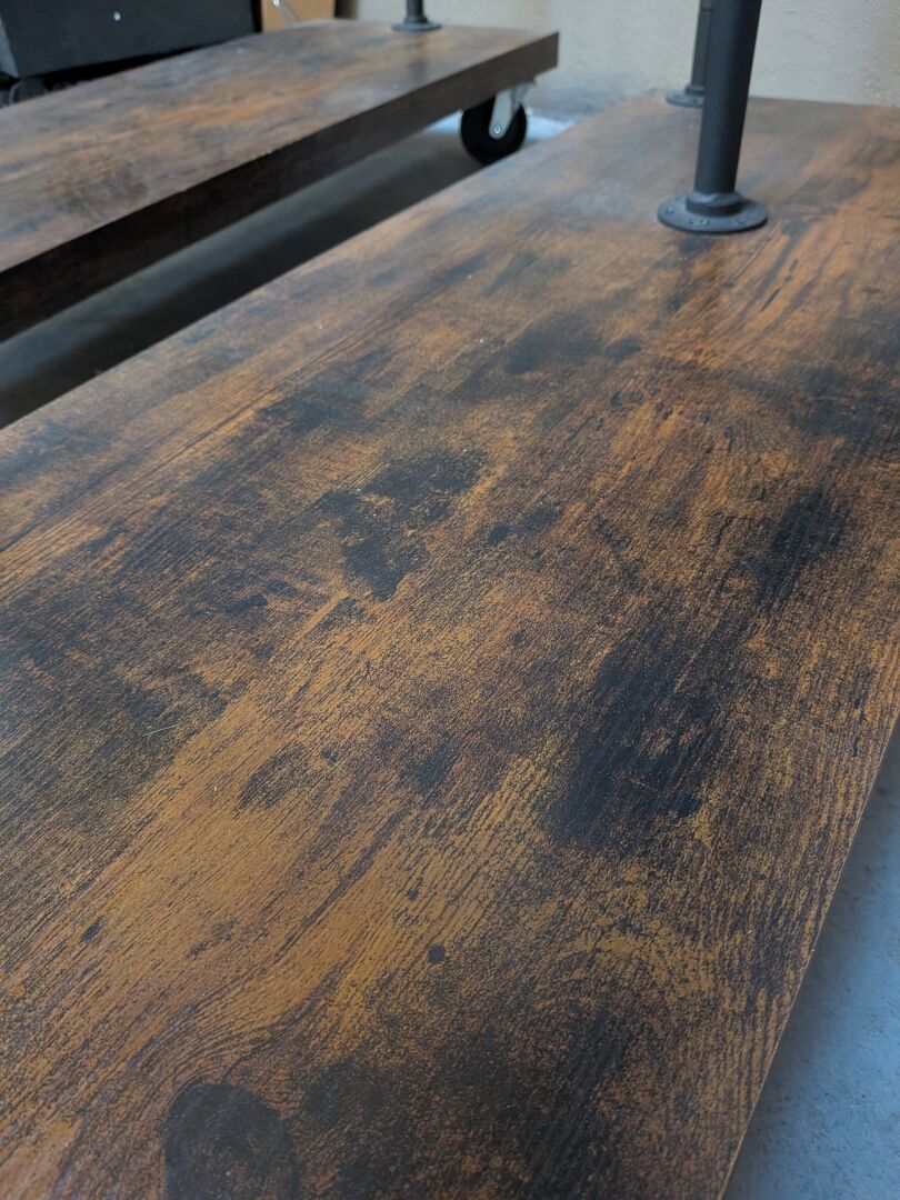 1 lot de 11 portants mobiles métal noir et bois type industriels dont 4 avec 3 tablettes . Dimensions unitaires : H 175cm L 103cm P 30cm