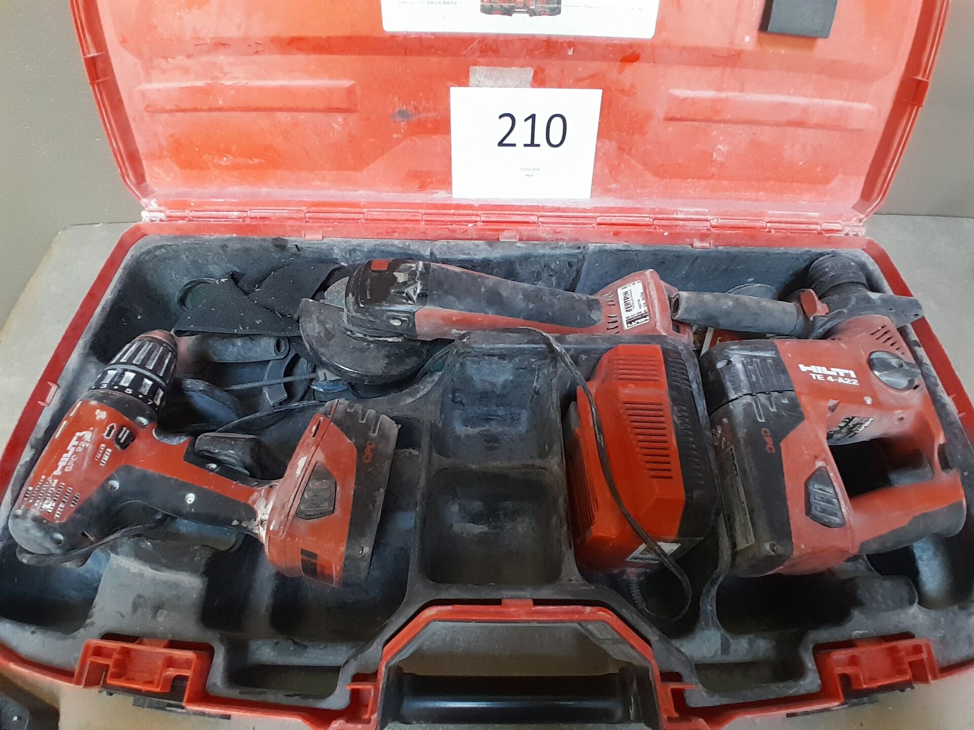 1 kit HILTI autonome comprenant : 1 perforateur HILTI TE4-A22 avec 1 chargeur No 565331 1 meuleuse d'angle AG 125-A22 No 591458, 1 batterie 1 visseuse SFC 22-A 1 batterie 1 chargeur