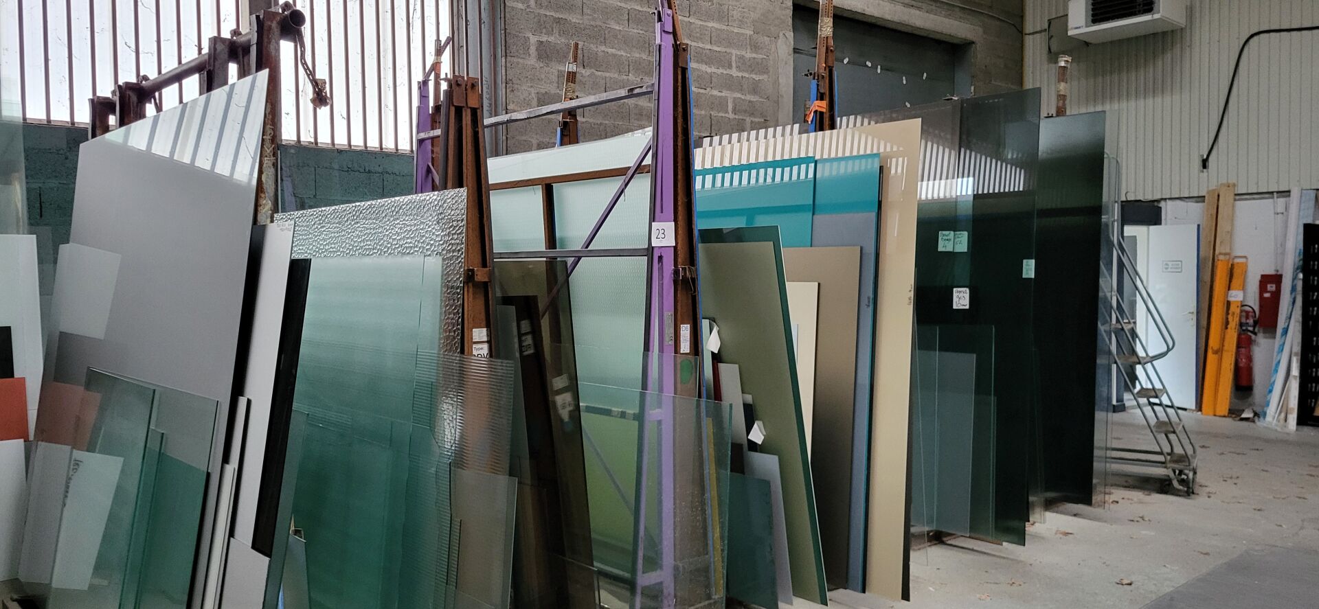 Vendu sur désignation le 02 03 2026 à 10h 24 rue du marché commun à Nantes, Enlèvement les 17/18/19 mars 2026 de 9h à 17h à CARQUEFOU - frais de mise à disposition 10 € TTC 7 chevalets acier pour panneaux de verre, diverses dimensions, dits "chevalets perdus" vendus avec le contenu de plaques de verre de différentes tailles et couleurs