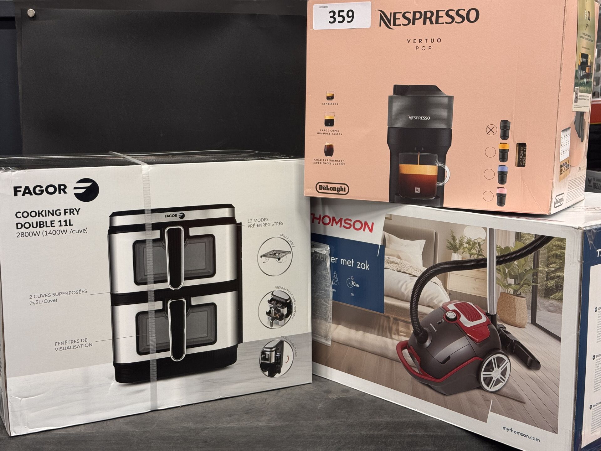 AIRFRYER FAGOR COOKING FRY DOUBLE + MACHINE A CAFE DELONGHI NESPRESSO VERTUO POP + ASPIRATEUR THOMSON (expédition sur devis) Lot issu de colis non réclamés : état de fonctionnement non garanti.
