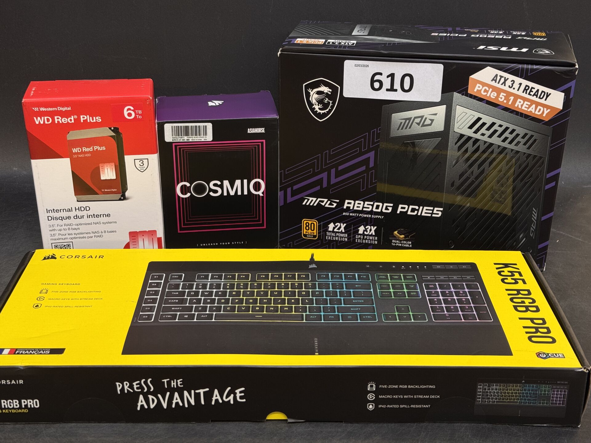 DISQUE DUR WESTERN DIGITAL WD RED PLUS 6TO + ALIMENTATION PC MSI MPG A850G + CLAVIER CORSAIR K55 RGB PRO + VENTILATEURS ASIANORSE EXPEDITION POSSIBLE (ce lot chez vous en France métropolitaine pour 36€) Lot issu de colis non réclamés : état de fonctionnement non garanti.