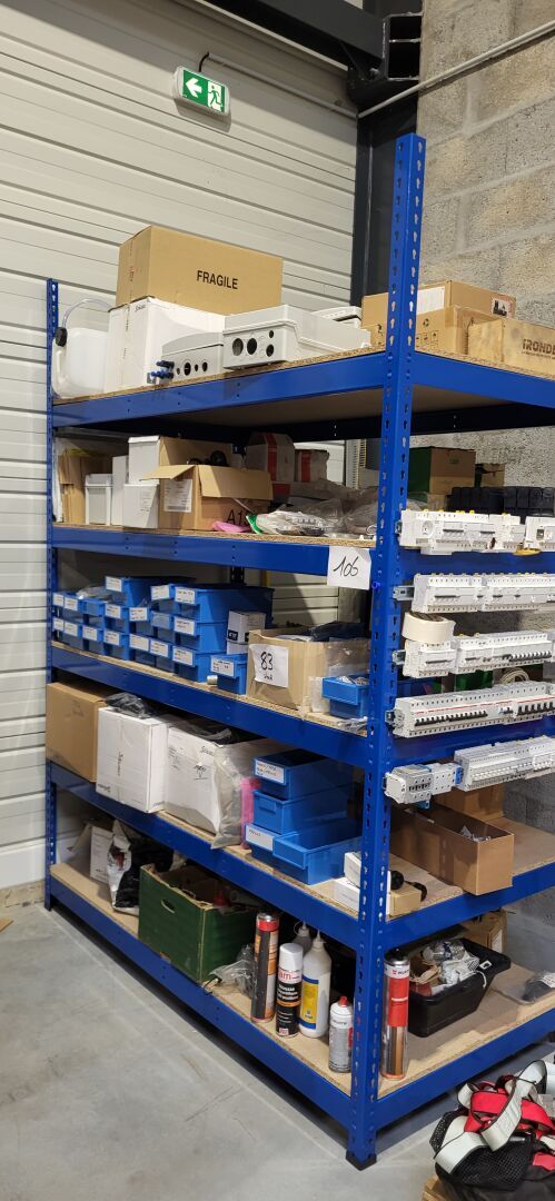 4 rayonnages bleus, 5 plateaux agglomérés dimensions de 1 rayonnage : 184 x 92 x 244 cm - vendu sans le contenu