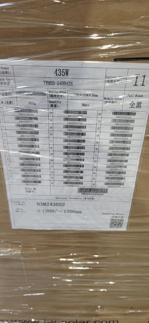 Sur 1 palette : 36 panneaux solaires 435W type DWMND-54HB435 1722 x 1134 x 30 mm couleur noire