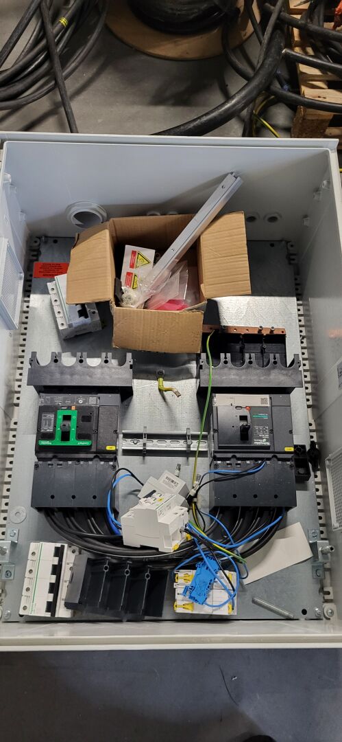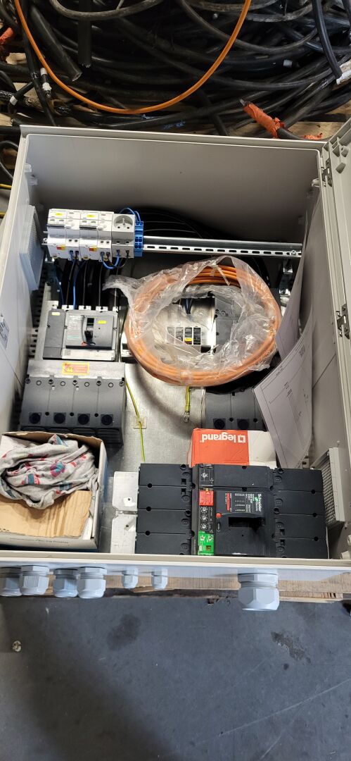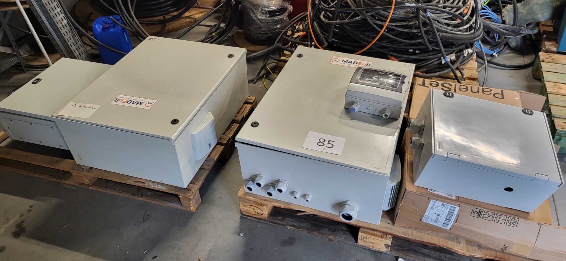 Sur 2 palettes : 2 coffrets électriques IDE POL806030 800 x 600 x 300 mm , 2 coffrets électriques SCHNEIDER NSYPLM43G (supposés vides) , 1 coffret électrique SCHNEIDER NSYS3D5420 vide, 1 boitier de raccordement<
