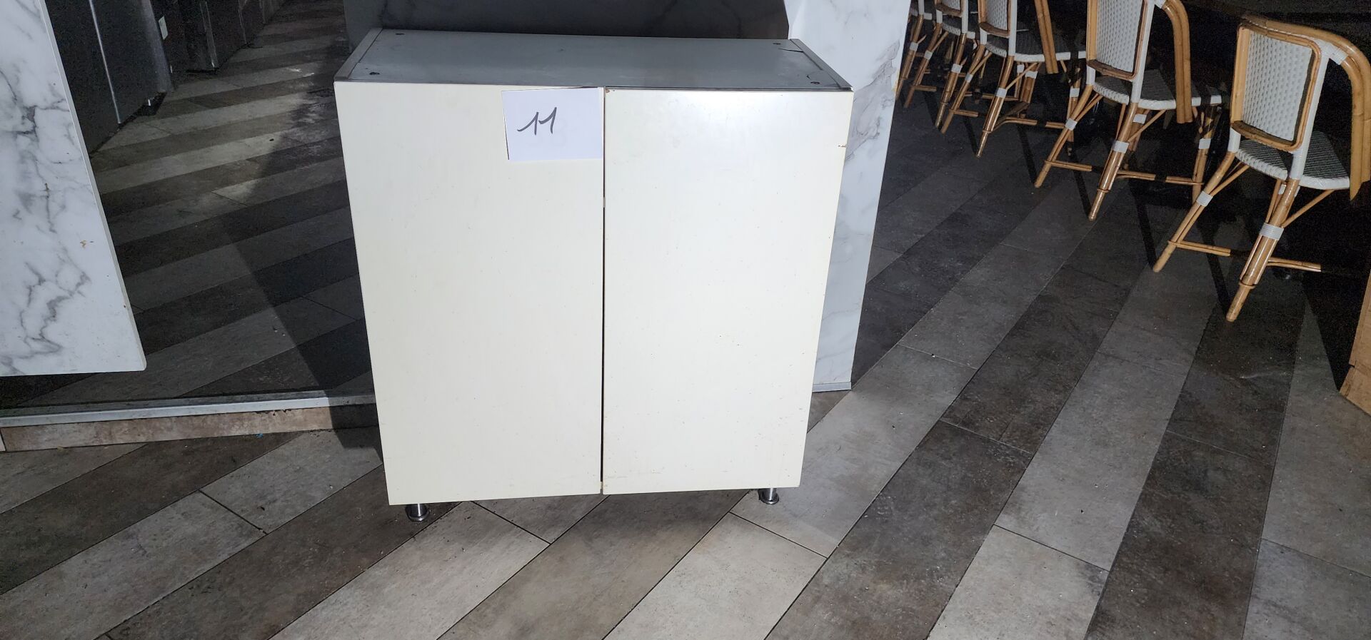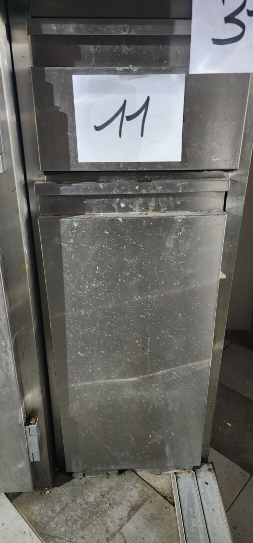 1 meuble poubelle mélaminé façon bois et vert, logoté MR ALBERT 70 x 60 x 134 cm 1 meuble mi-hauteur mélaminé blanc 2 portes 80 x 40 x 88 cm, 2stop-trottoirs en alu 63 x 120 cm 1 meuble poubelle inox 2 tiroirs, 34x60 cm