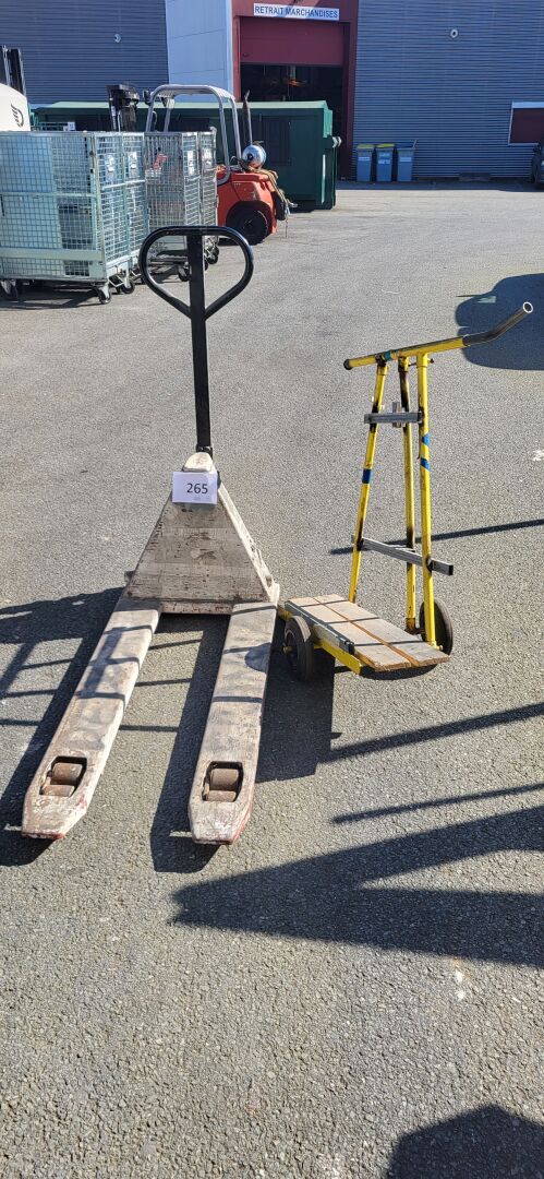 1 transpalette sans marque ni capacité apparente (ne lève pas) 1 chariot porte charge métal jaune