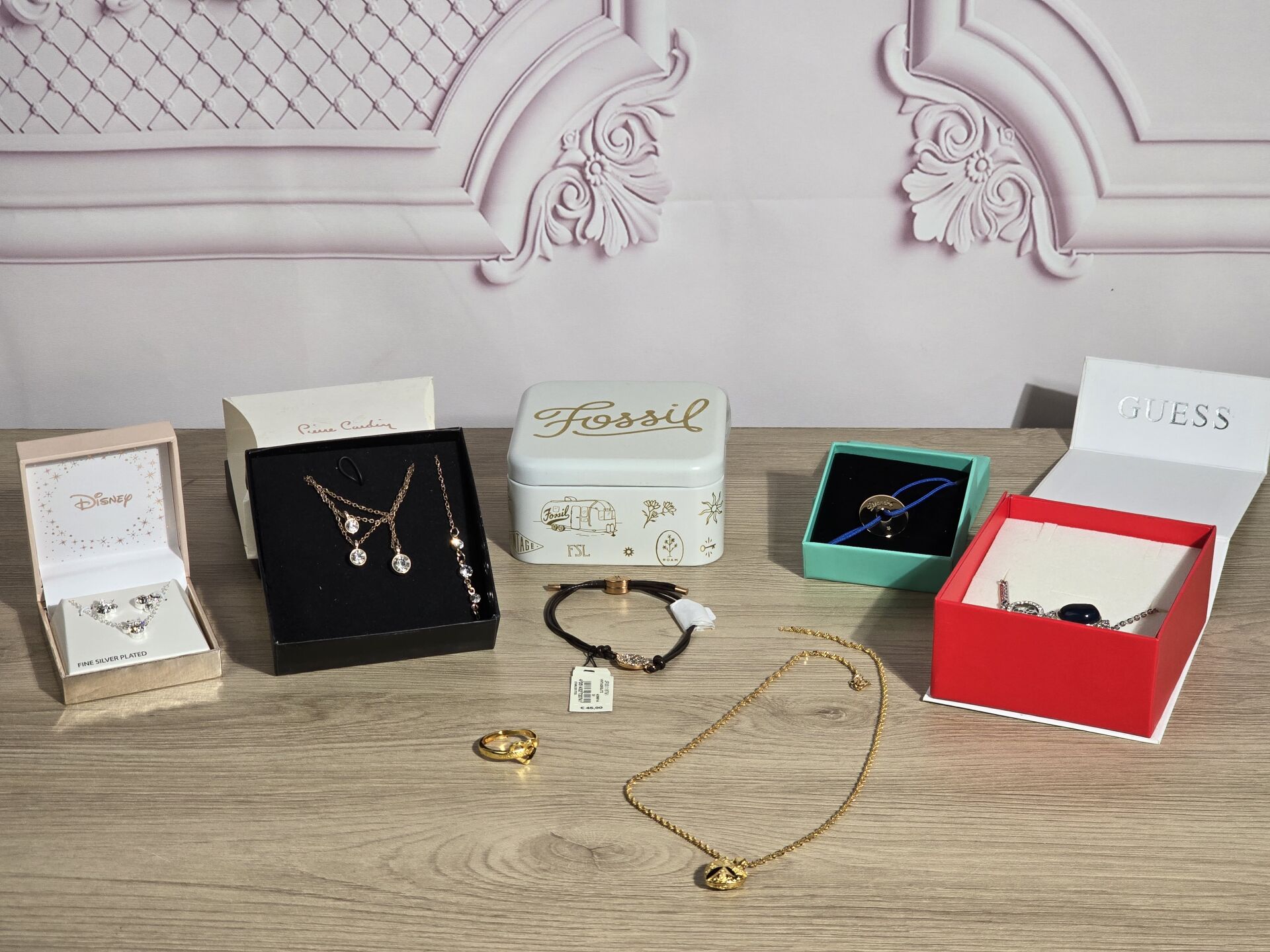Fort ensemble d'environ 100 bijoux fantaisie dont colliers, bagues, bracelets, boucles d'oreilles… Différentes marques : FERRARI, GUESS, FOSSIL, Pierre CARDIN, DISNEY… etc et sans marque apparente