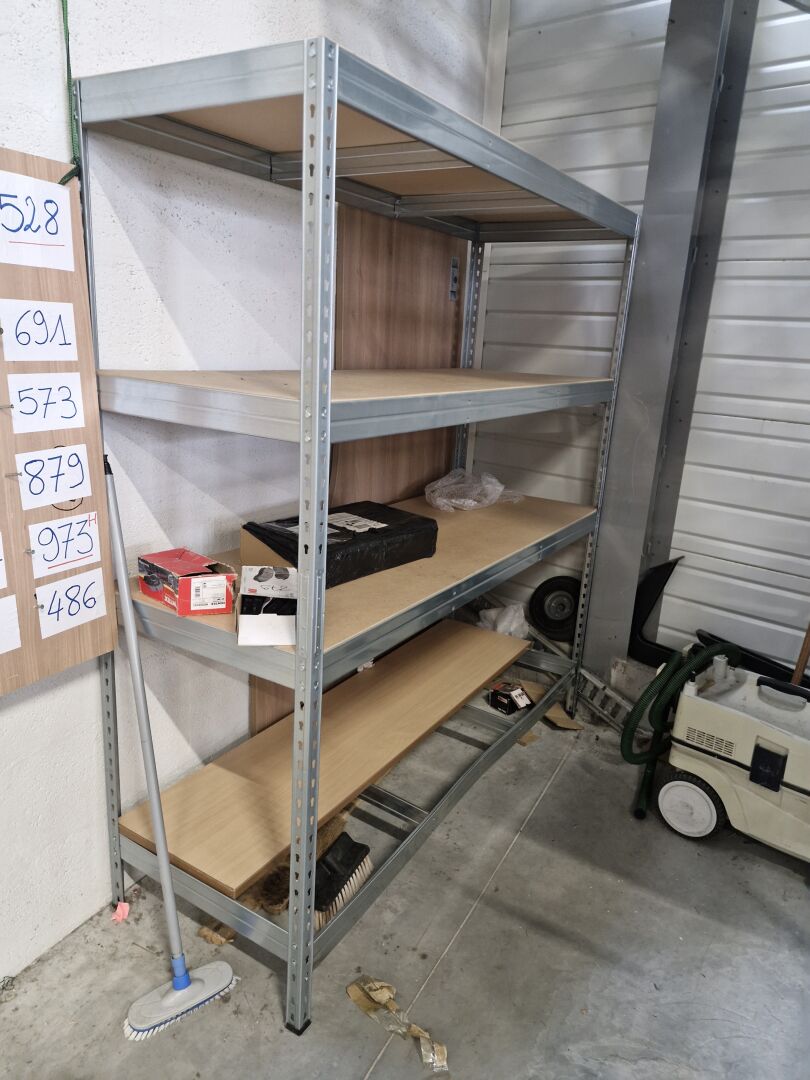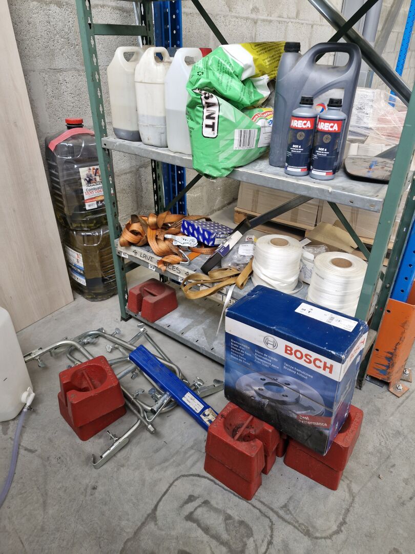 1 étagère cornière à 4 niveaux 166 X 60 x 180 cm 1 étagère métallique 1 meuble métallique à hauteur d'appui 120 x 45 cm, 1 chariot porte-fut 60 L 1 établi pliable , 1 niveau à bulle, disques de freins BOSCH BD1549 en carton 1 bidon de 20 L de combustible pour chauffage accessoires pour camion caisse etc...