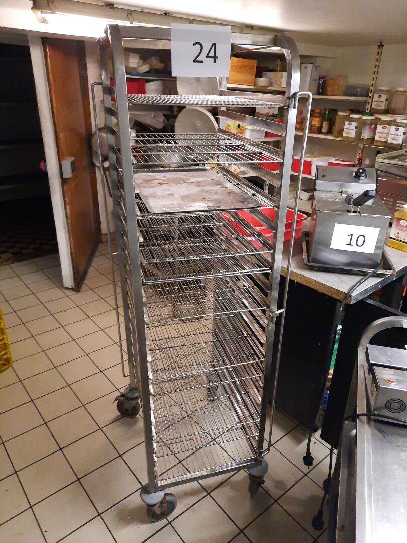 Échelle en inox roulante à 20 niveaux On joint : 12 grilles 40x60 cm LOT SITUE AU SOUS SOL - PREVOIR MOYEN MATERIEL ET HUMAIN POUR DELIVRANCE VIA UN ESCALIER