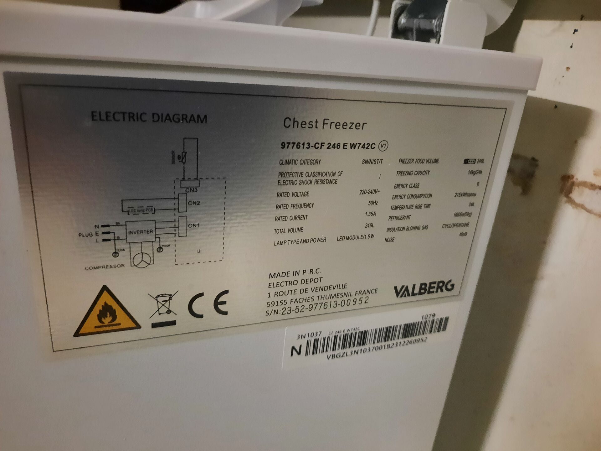 Congélateur bahut VALBERG capacité 246 L. 95x80x59 cm LOT SITUE AU SOUS SOL - PREVOIR MOYEN MATERIEL ET HUMAIN POUR DELIVRANCE VIA UN ESCALIER