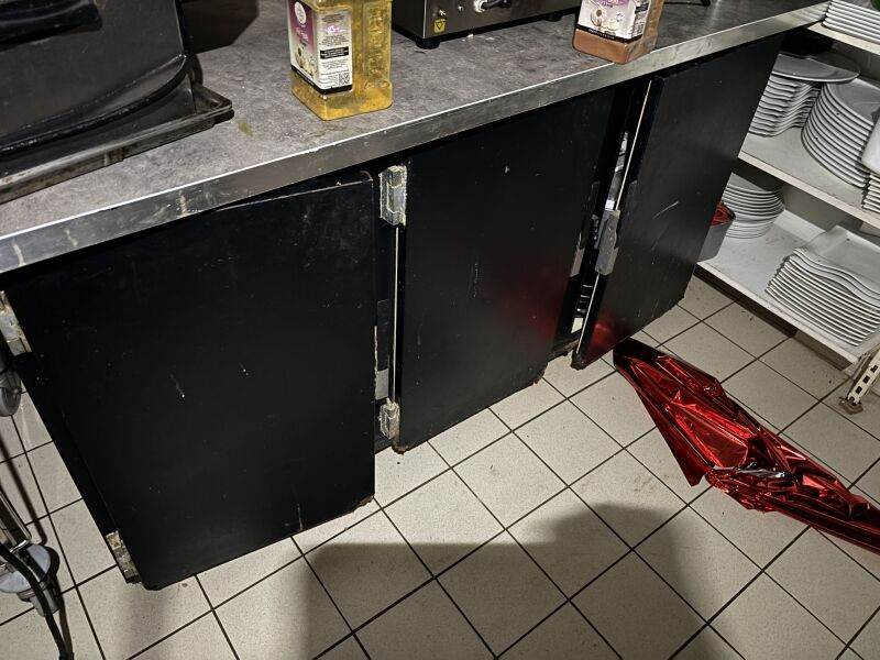 Desserte en métal laqué blanc et inox à 3 niveaux Table en métal et mélaminé blanc à 1 étagère (mauvais état) Meuble bas en mélaminé noir et gris à 3 vantaux (mauvais état) LOT SITUE AU SOUS SOL - PREVOIR MOYEN MATERIEL ET HUMAIN POUR DELIVRANCE VIA UN ESCALIER